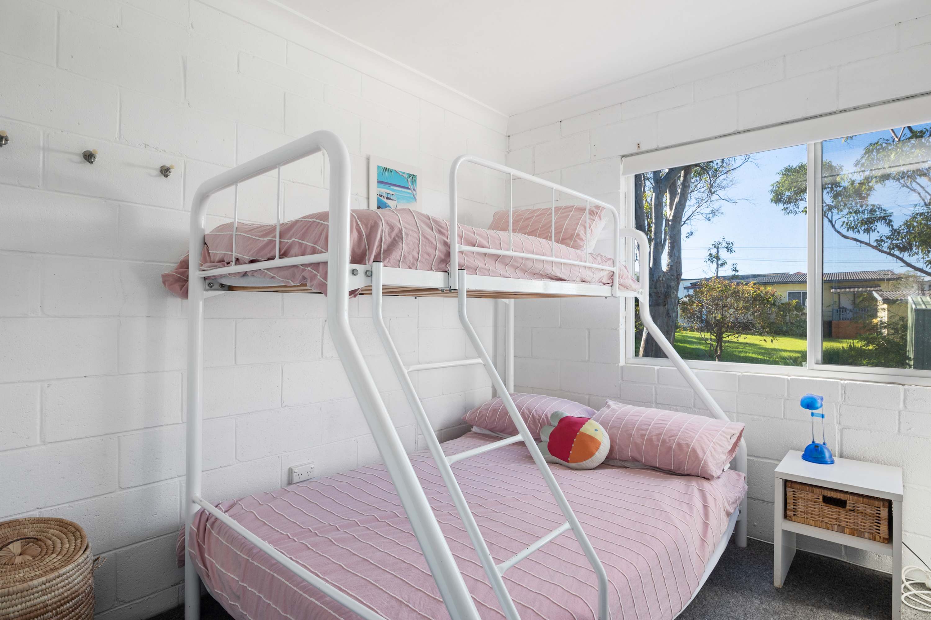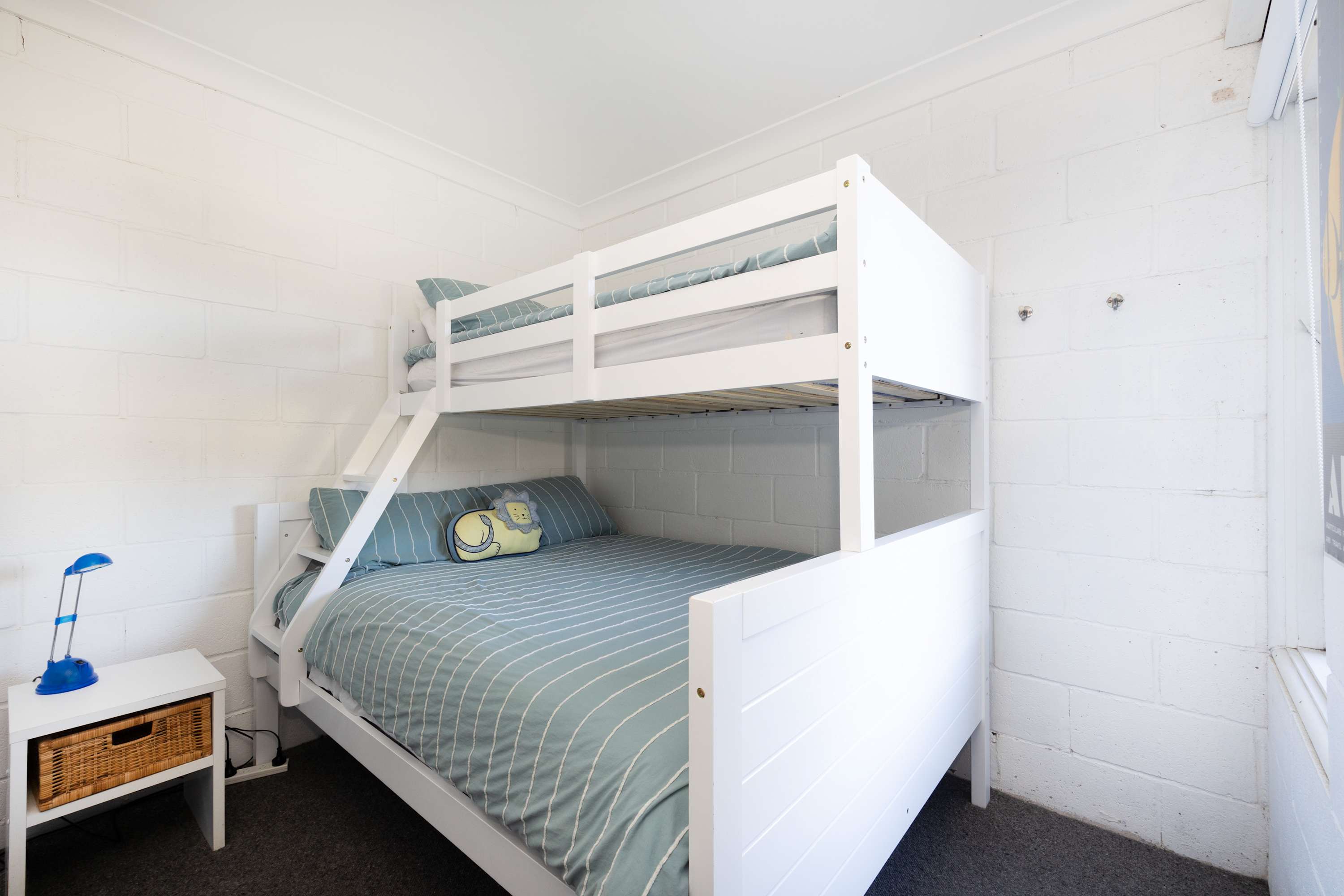There are 4 bedrooms, one with a queen bed, one with a double bed, and 2 with a tri-bunk in each (double on bottom, single on top) , along with 2 bathrooms. Downstairs is set up as a separate self-contained unit with kitchenette, making this an ideal holiday home for 2 families.