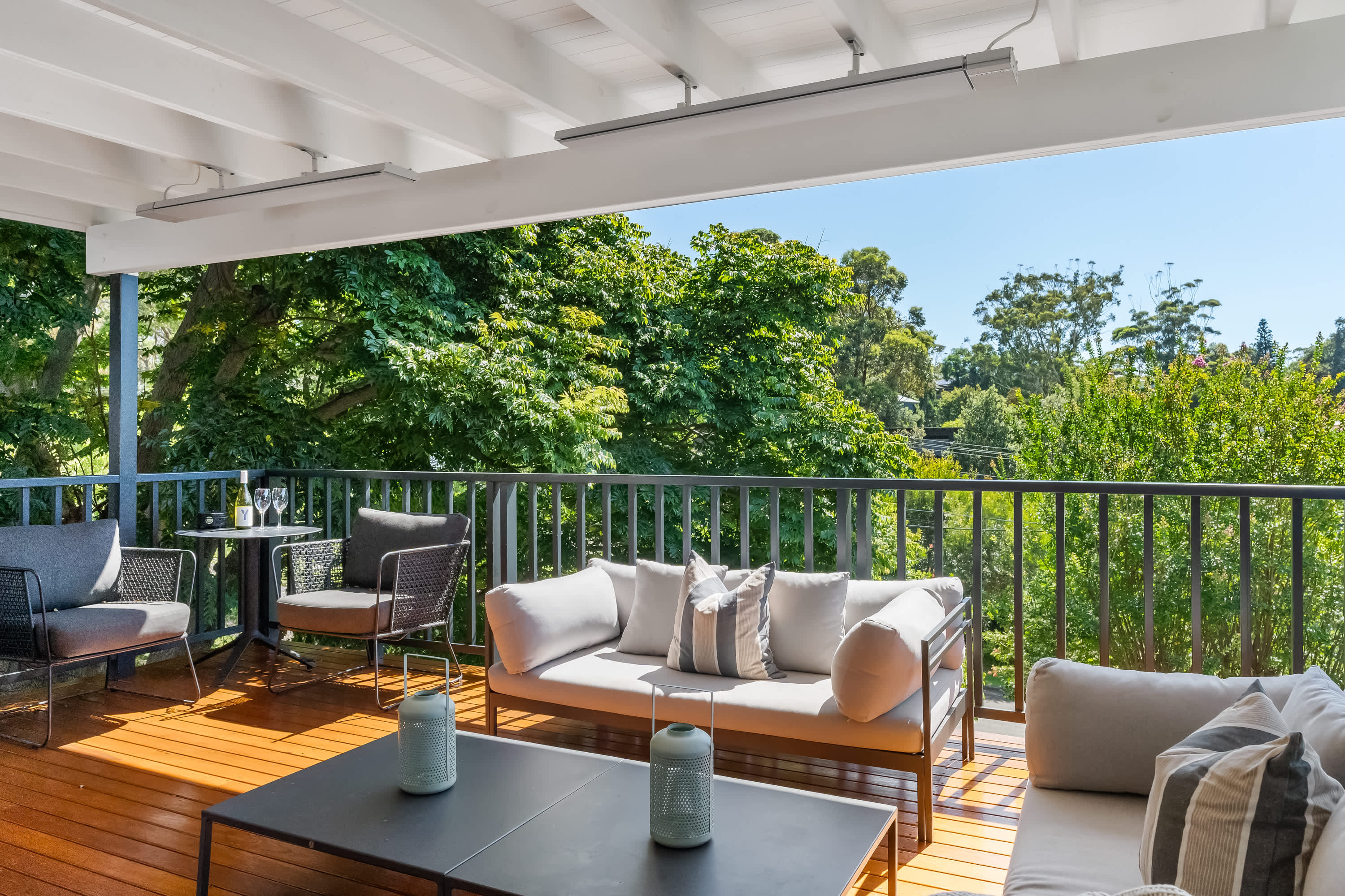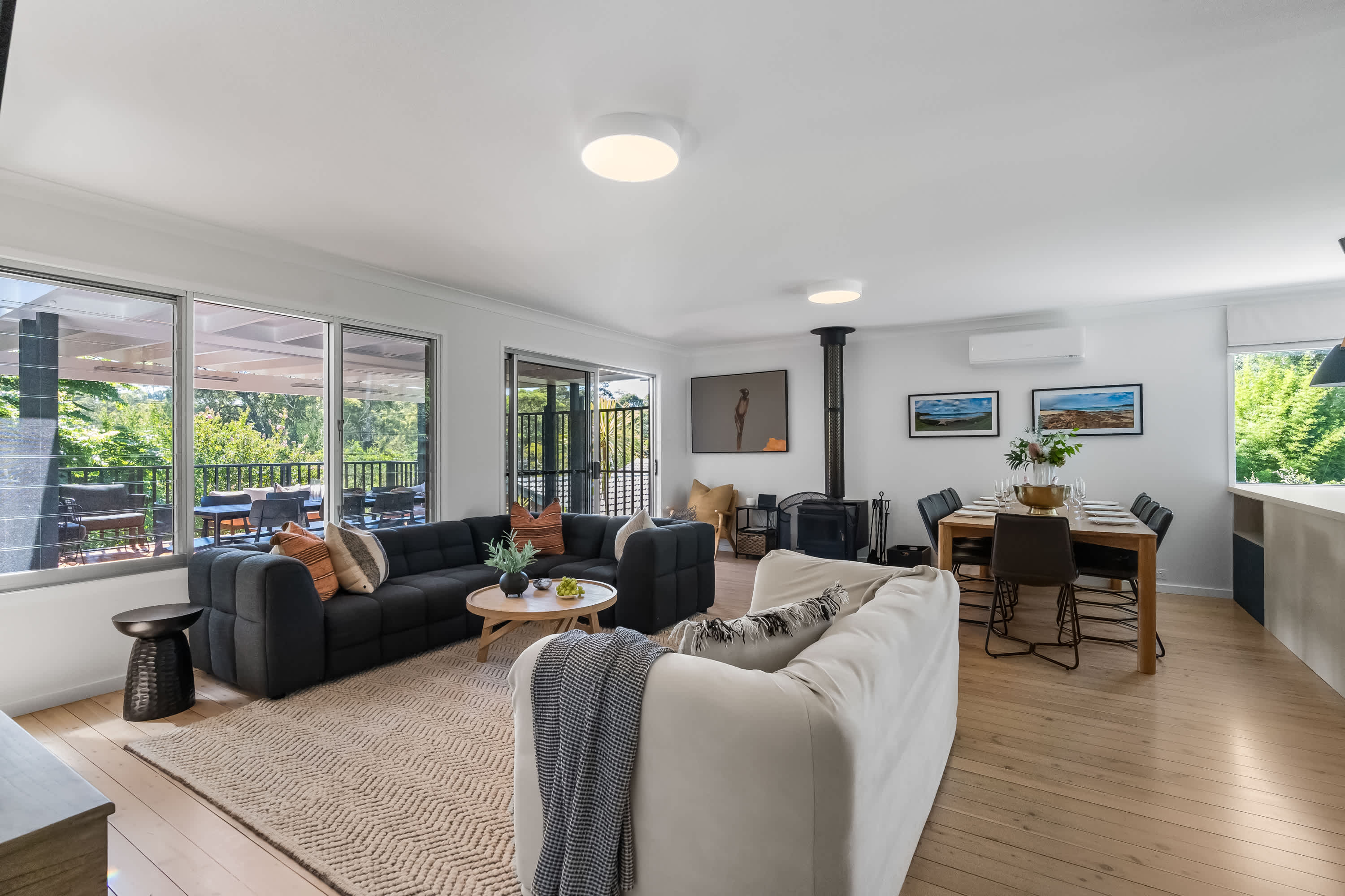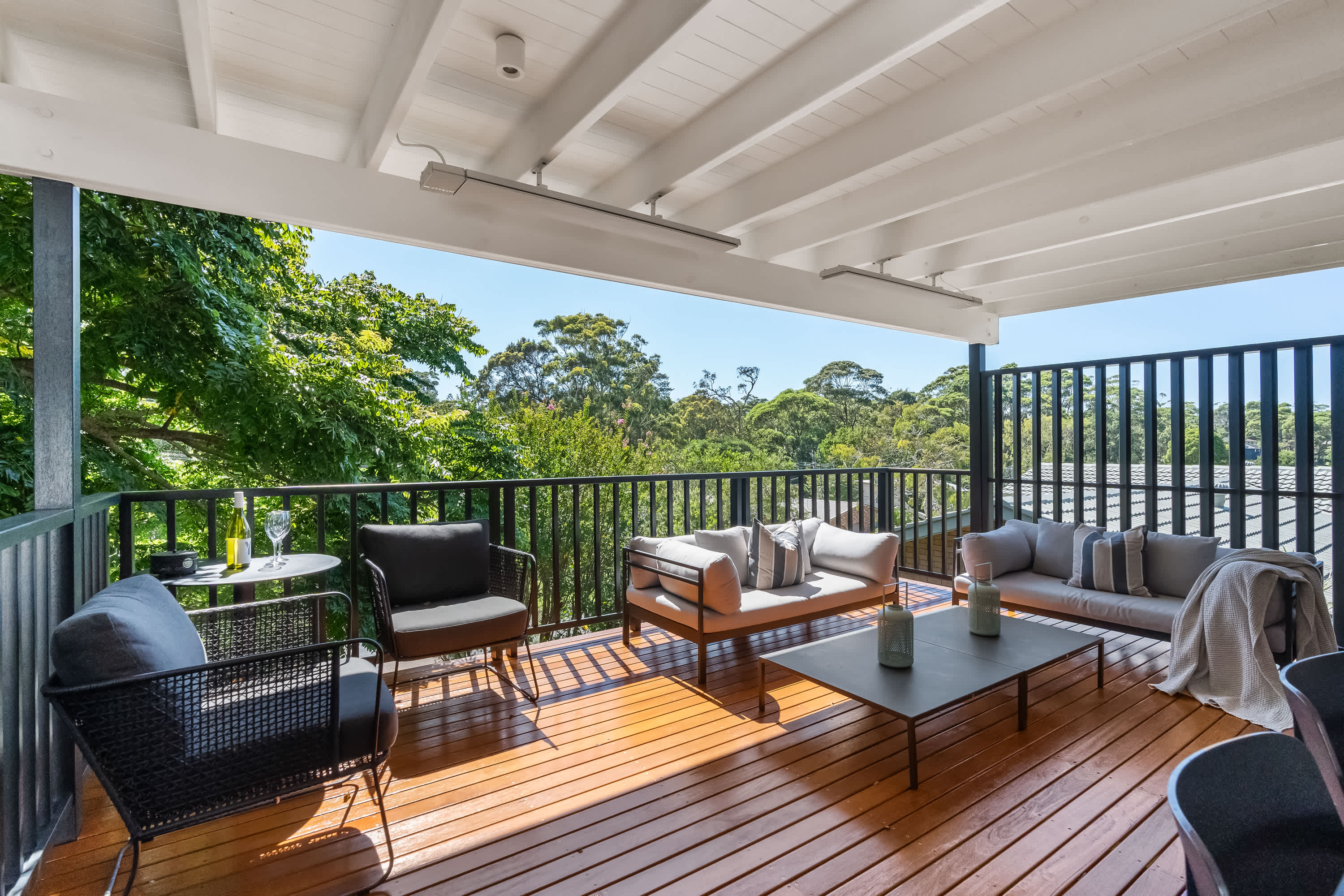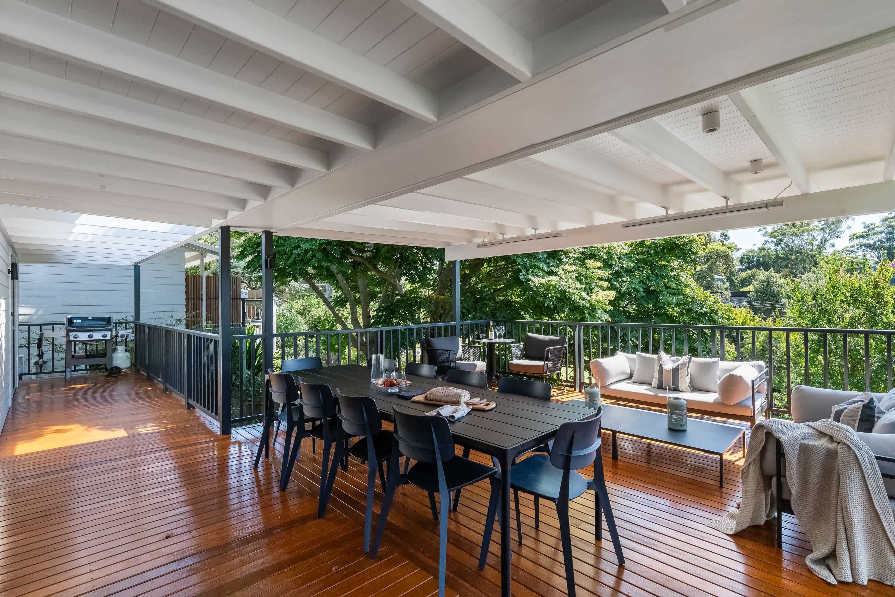 Outdoor living is a highlight, with a covered verandah surrounded by tree canopies provide privacy giving the feel of a rainforest like tranquil retreat, enjoy a cup of coffee whilst listening to the sounds of nature. The space is equipped with comfortable outdoor furniture and electric strip heaters, perfect for enjoying a family BBQ or relaxing on cooler evenings. Designed with both indoor and outdoor living in mind, this coastal beach house offers the ideal environment for a relaxing and memorable holiday.
