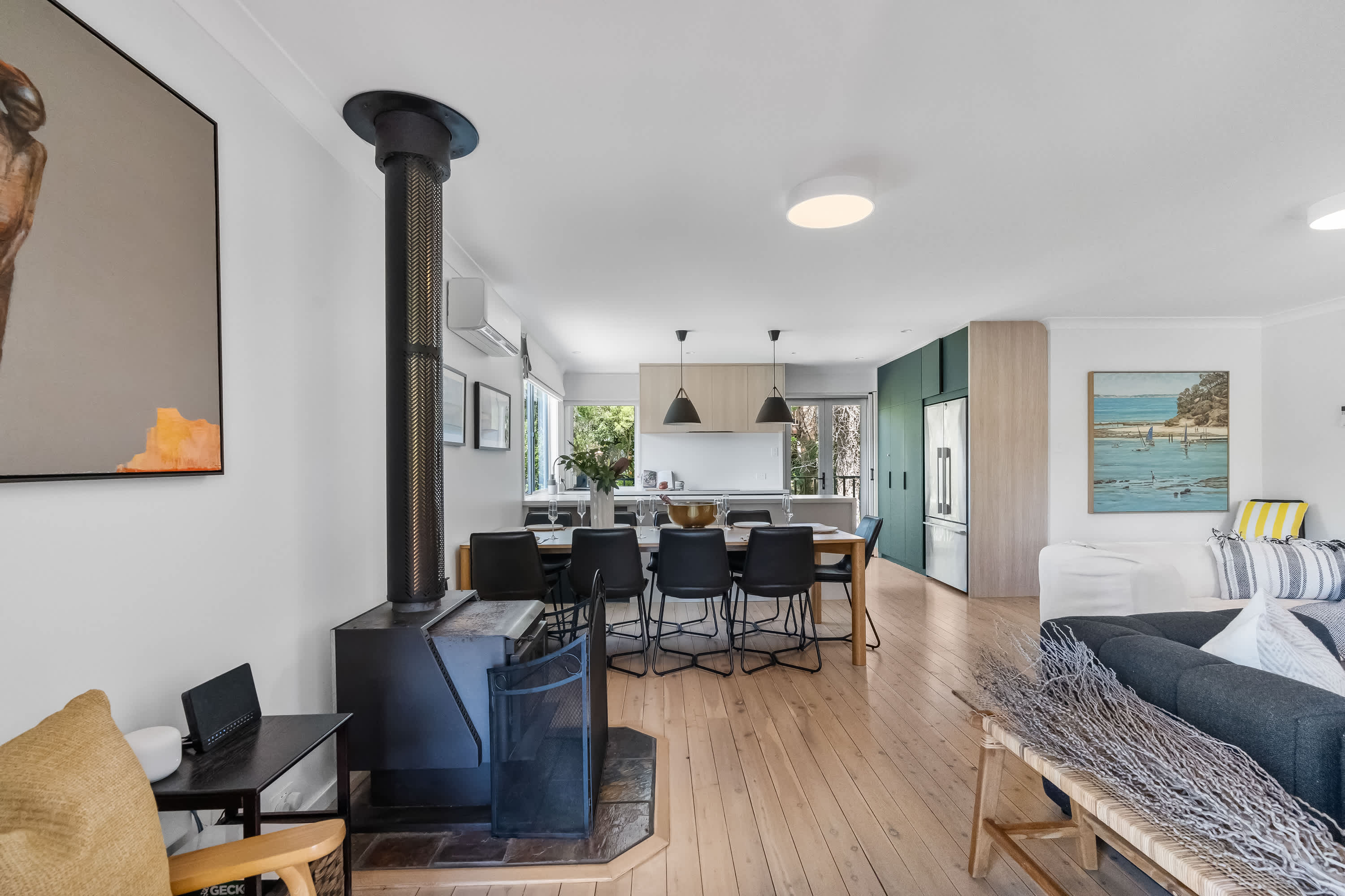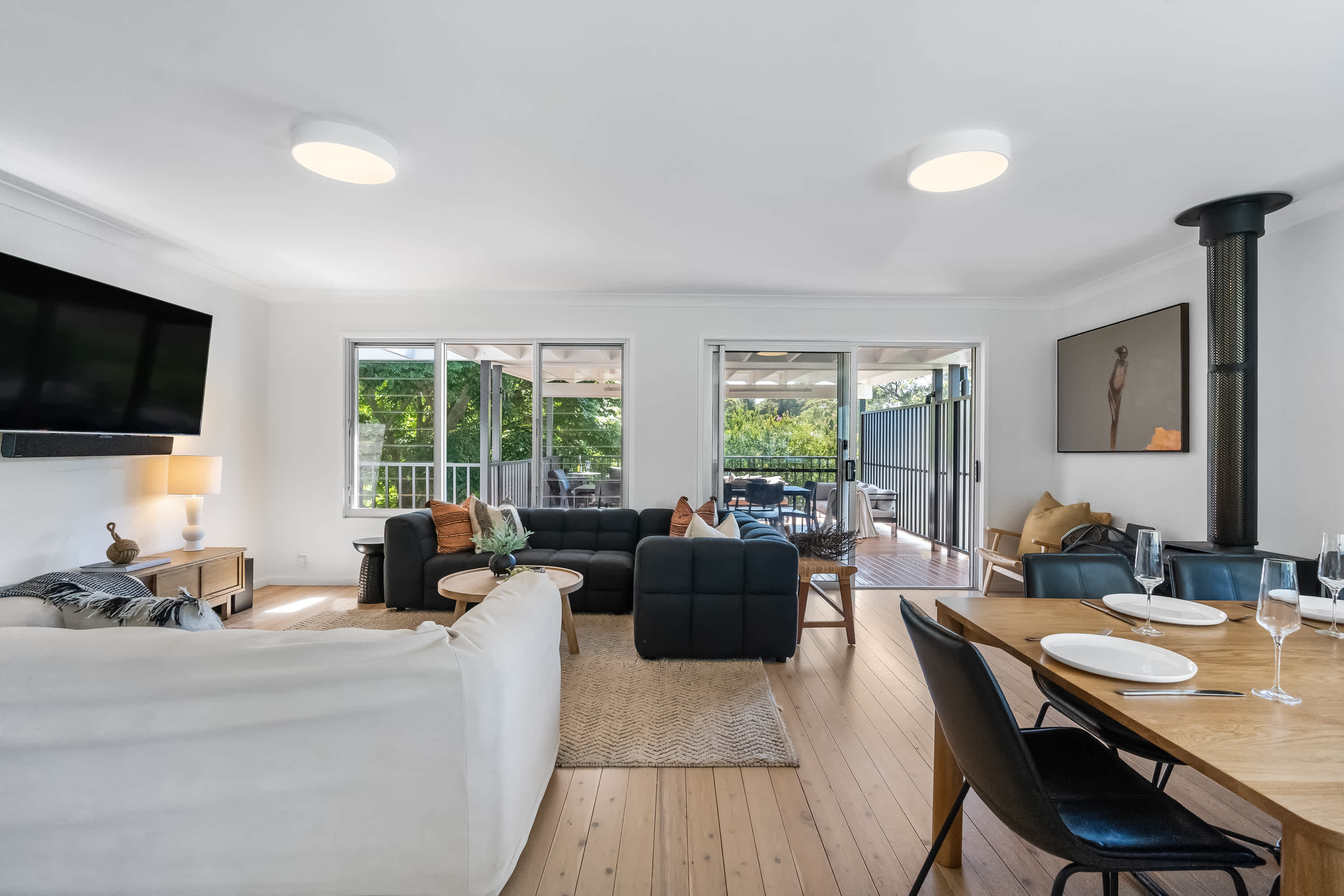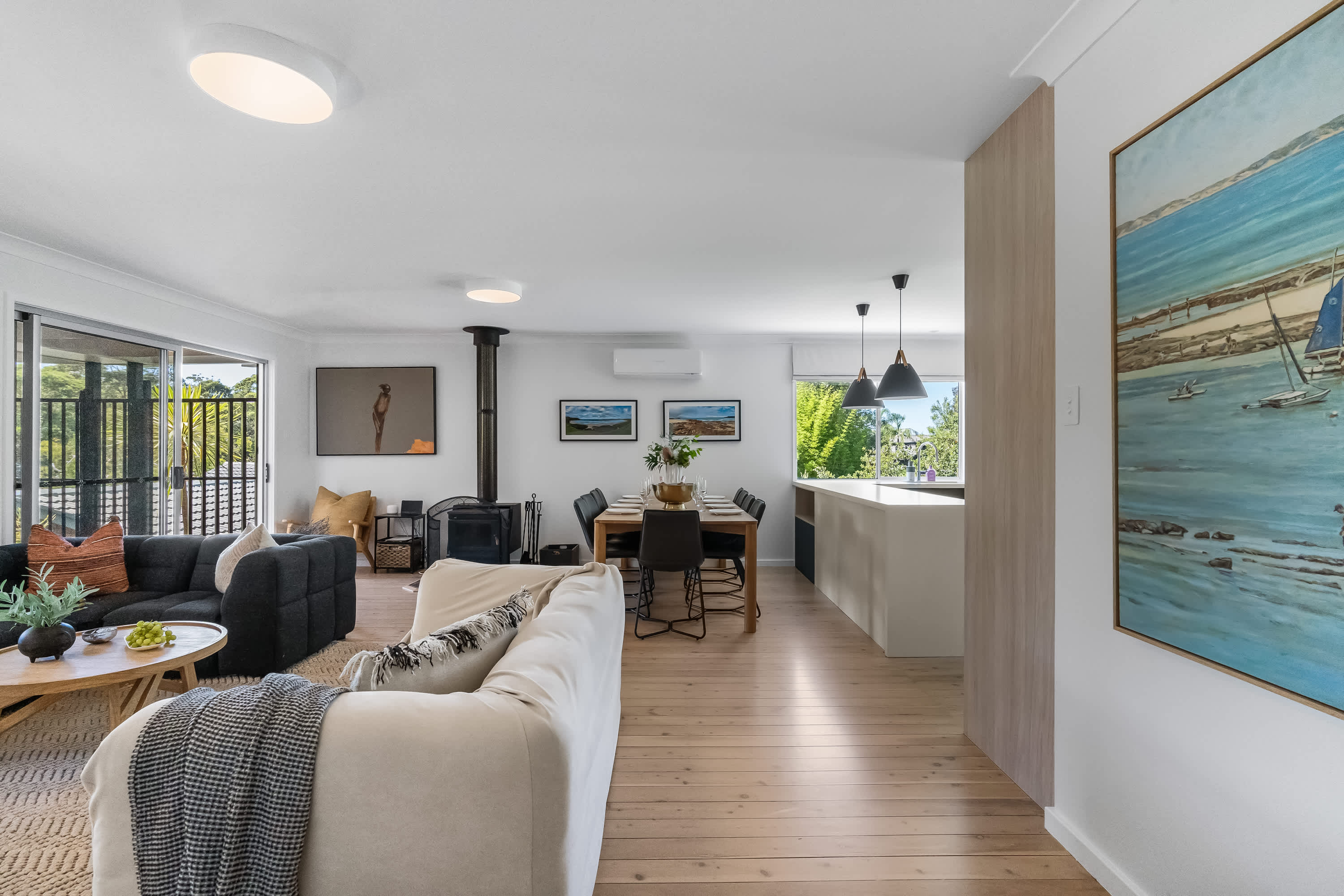 Outdoor living is a highlight, with a covered verandah surrounded by tree canopies provide privacy giving the feel of a rainforest like tranquil retreat, enjoy a cup of coffee whilst listening to the sounds of nature. The space is equipped with comfortable outdoor furniture and electric strip heaters, perfect for enjoying a family BBQ or relaxing on cooler evenings. Designed with both indoor and outdoor living in mind, this coastal beach house offers the ideal environment for a relaxing and memorable holiday.