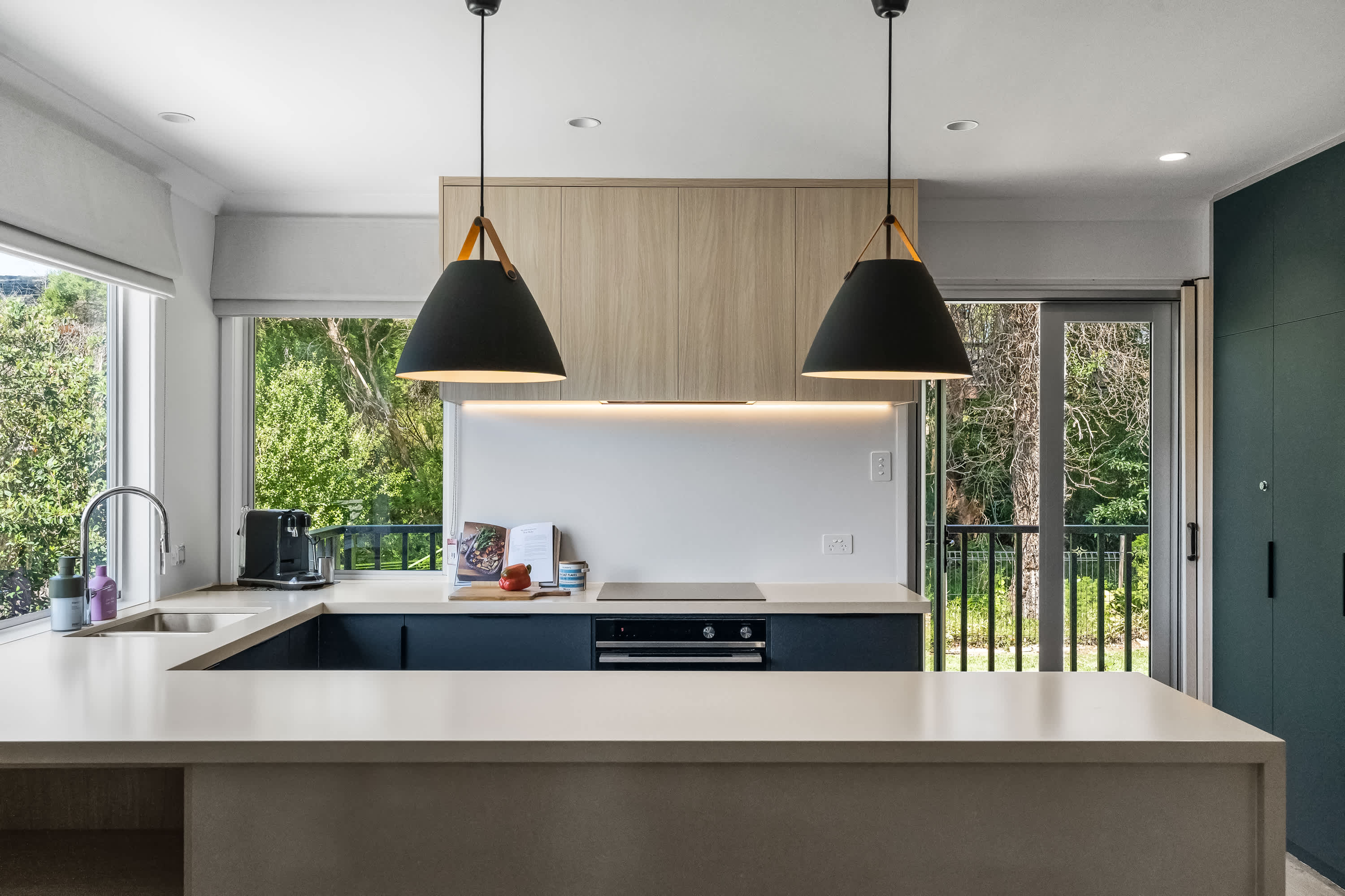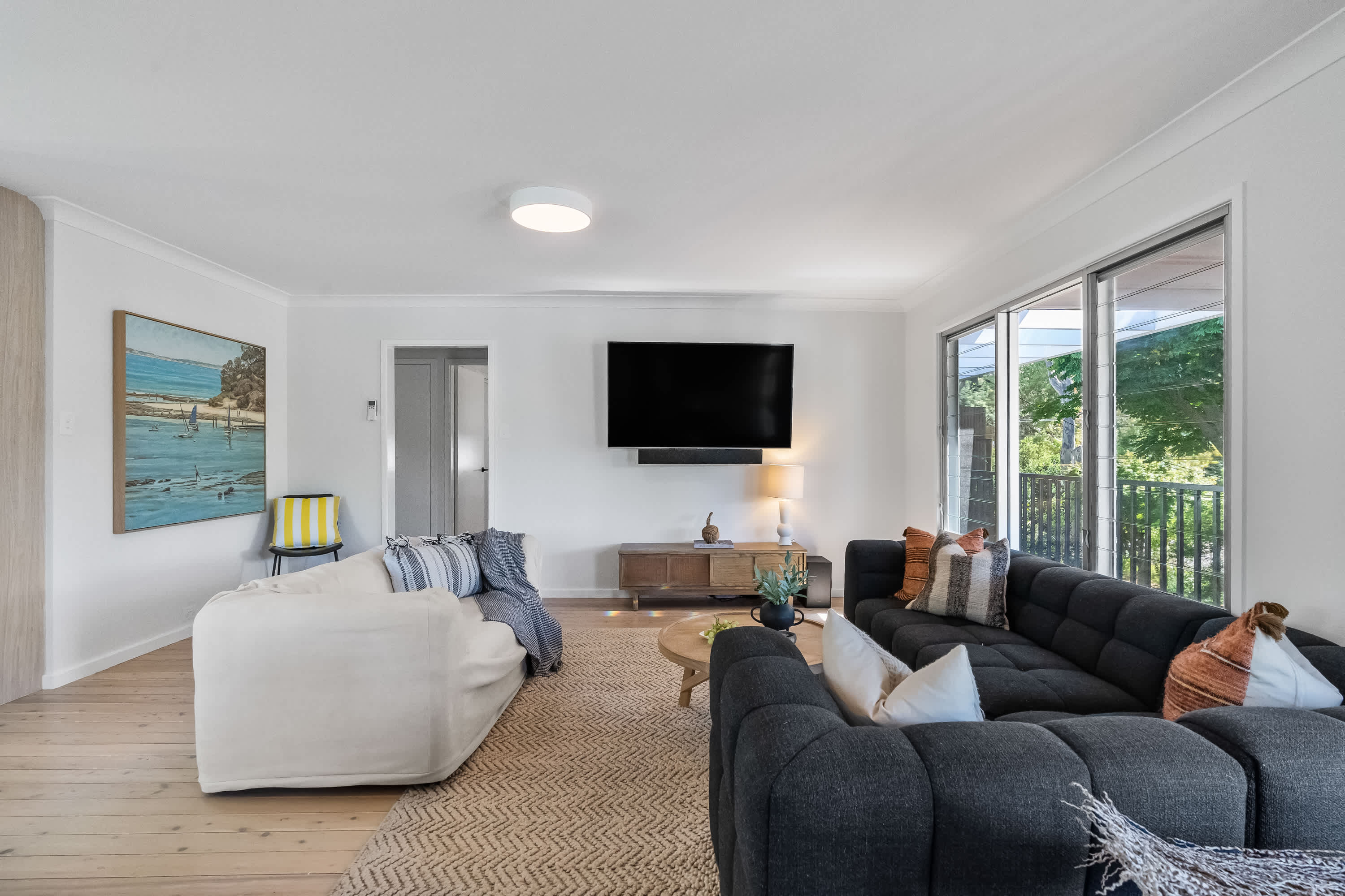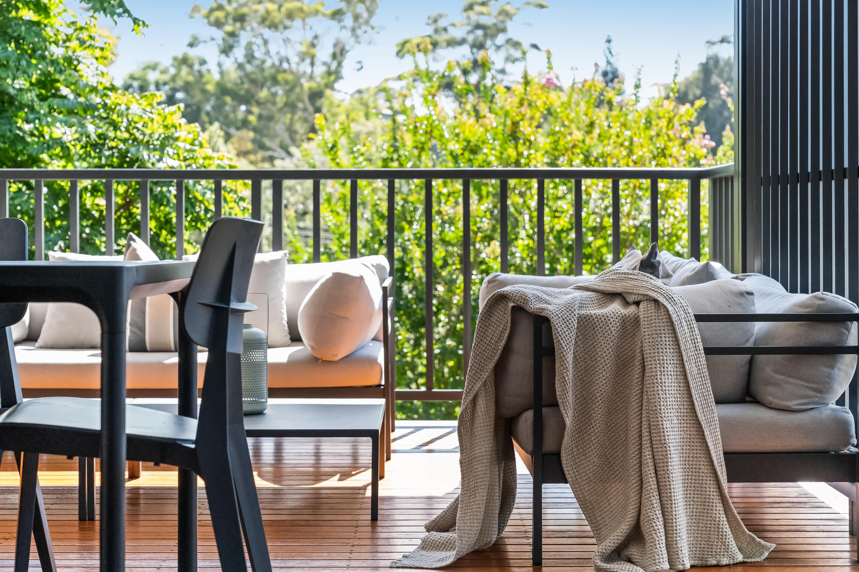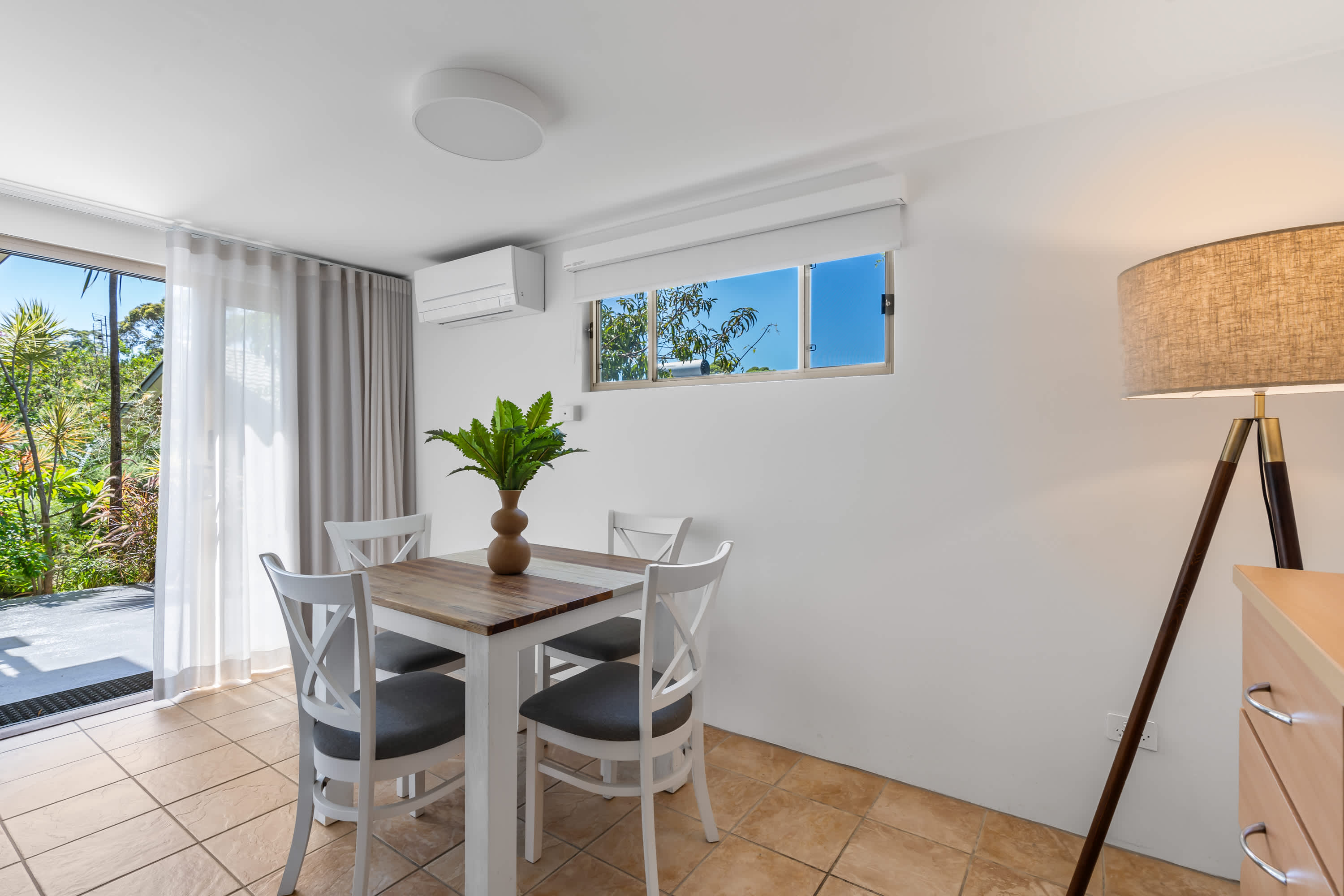 Outdoor living is a highlight, with a covered verandah surrounded by tree canopies provide privacy giving the feel of a rainforest like tranquil retreat, enjoy a cup of coffee whilst listening to the sounds of nature. The space is equipped with comfortable outdoor furniture and electric strip heaters, perfect for enjoying a family BBQ or relaxing on cooler evenings. Designed with both indoor and outdoor living in mind, this coastal beach house offers the ideal environment for a relaxing and memorable holiday.
