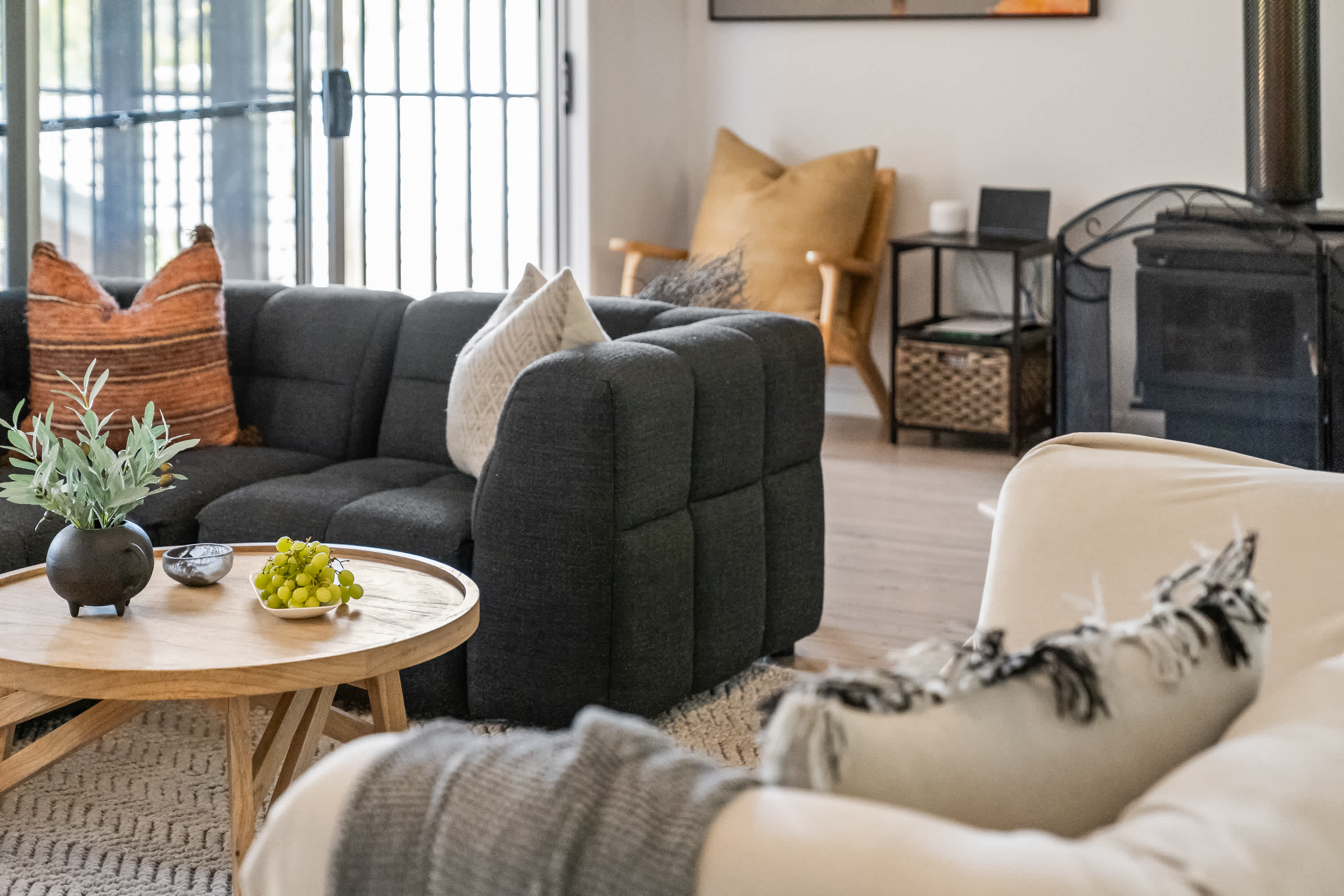 The living room is the heart of the home, with a wood fireplace creating a cozy atmosphere for family gatherings. The property provides Wifi and a large smart TV so guests can log in to their favorite streaming services and unwind in the evenings
