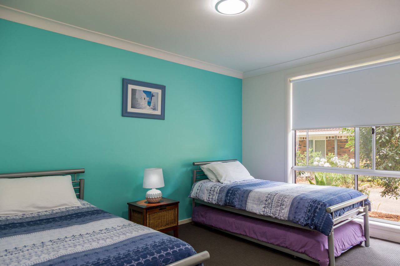 All our bedrooms are carpeted, with a queen and television in the main bedroom, a queen in the second bedroom and third bedroom includes a bunk bed (double at the bottom and single at the top) as well as a single bed and trundle.