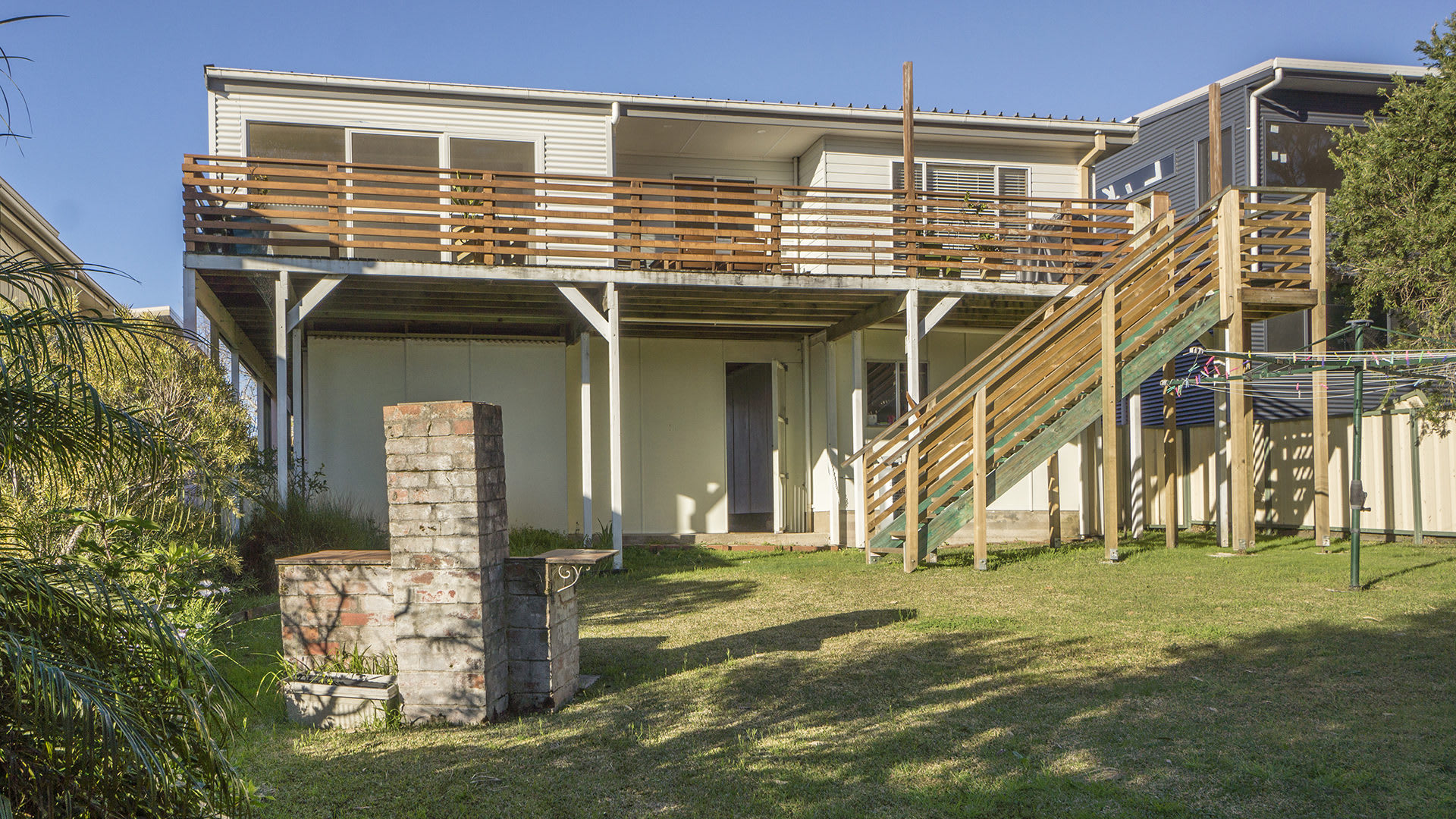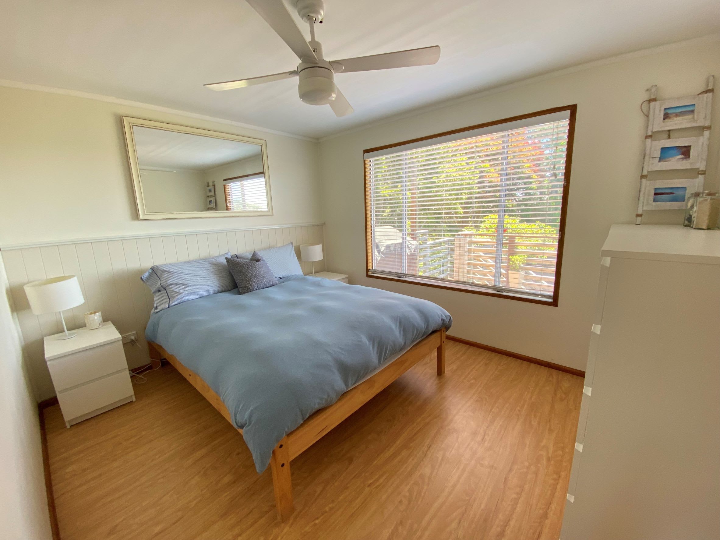 The bedroom configuration comprises three rooms. The master suite is the epitome of comfort, featuring a queen bed and a ceiling fan for those hot summer days. The second bedroom has 2 single beds. The third bedroom is located downstairs and features 1 double bed and a tri bunk (single over double)