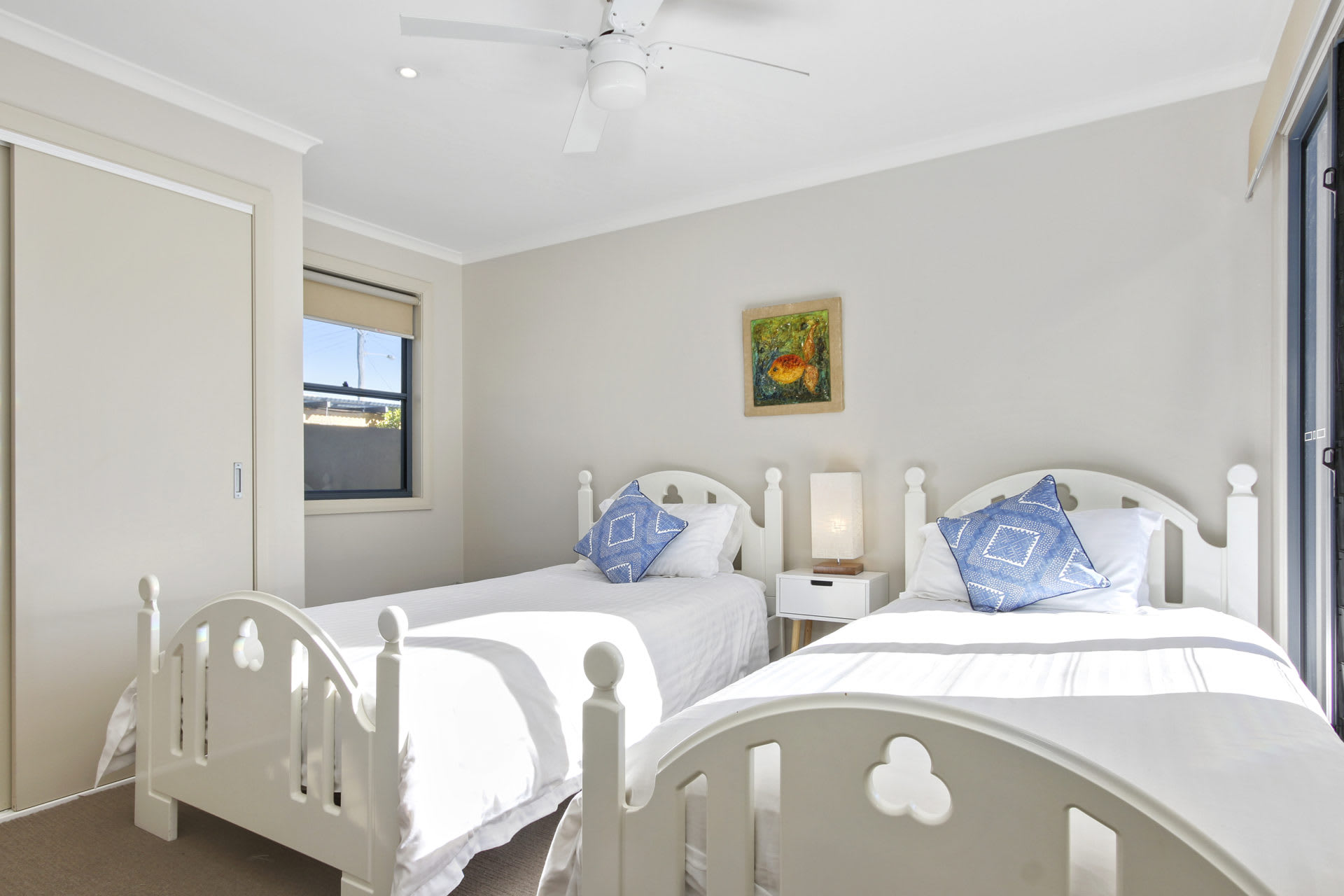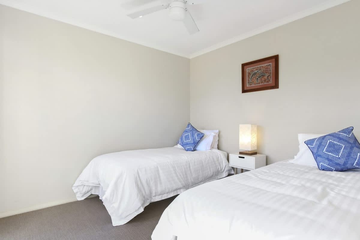 The master bedroom is located upstairs with a queen bed, ensuite and air-conditioner and the other bedrooms are located on the ground level, all rooms throughout the house have ceiling fans. The second bedroom supports a queen bed, the third has two king single beds, and the fourth supports two single beds. There is a three way bathroom joined to two of the bedrooms for guests convenience. Wi-Fi and Foxtel s provided for guests use.