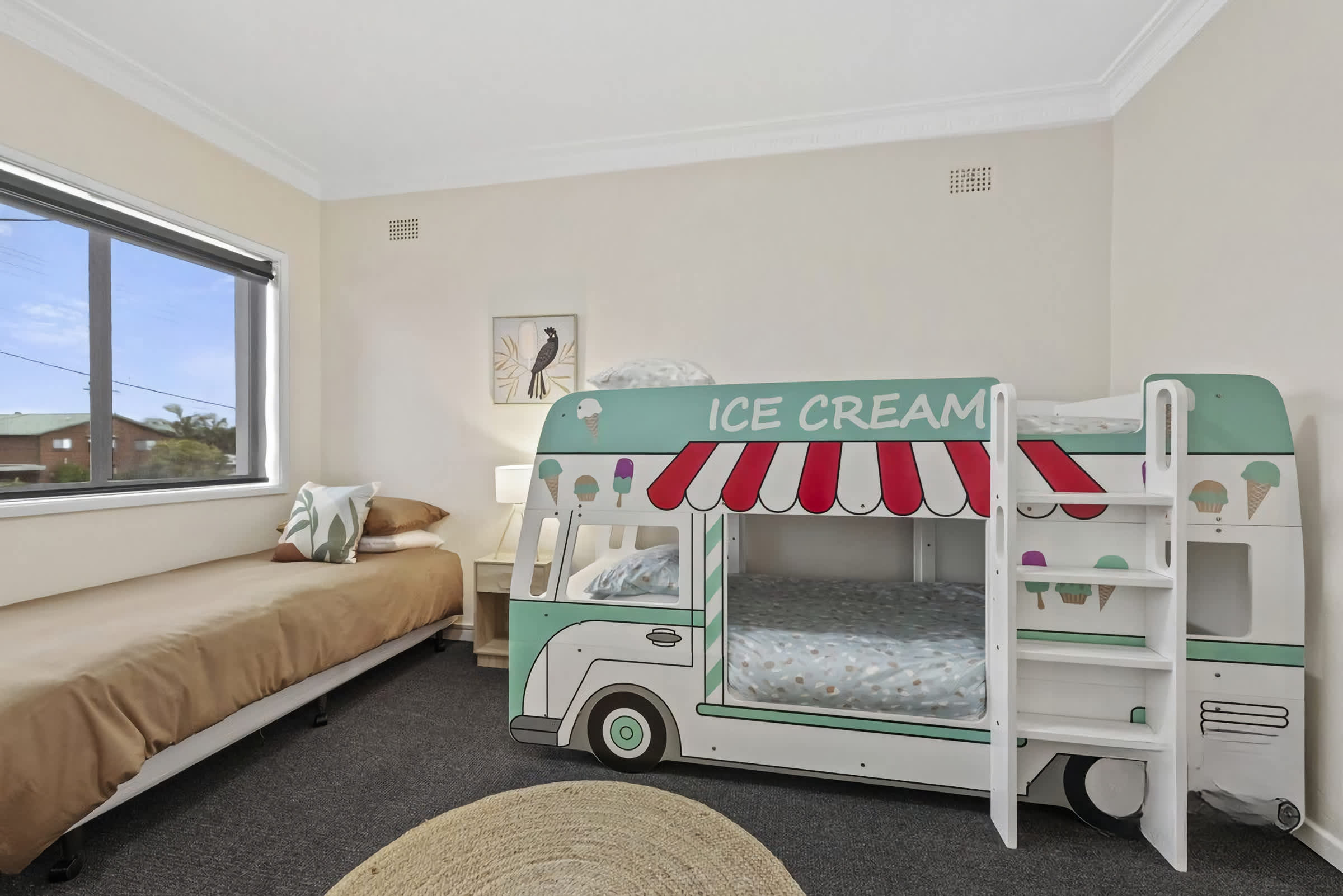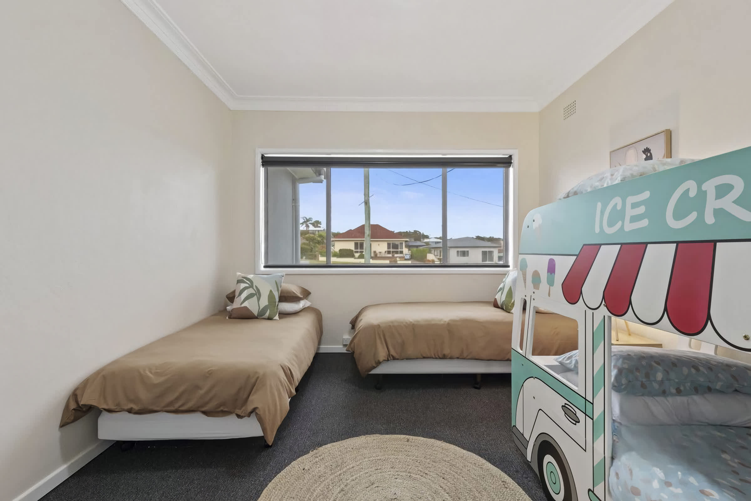 Bedroom 3: 2 x Single beds and 1 x single bunk bed (for small children only as its an ice-cream truck bed and not a full size bunk)