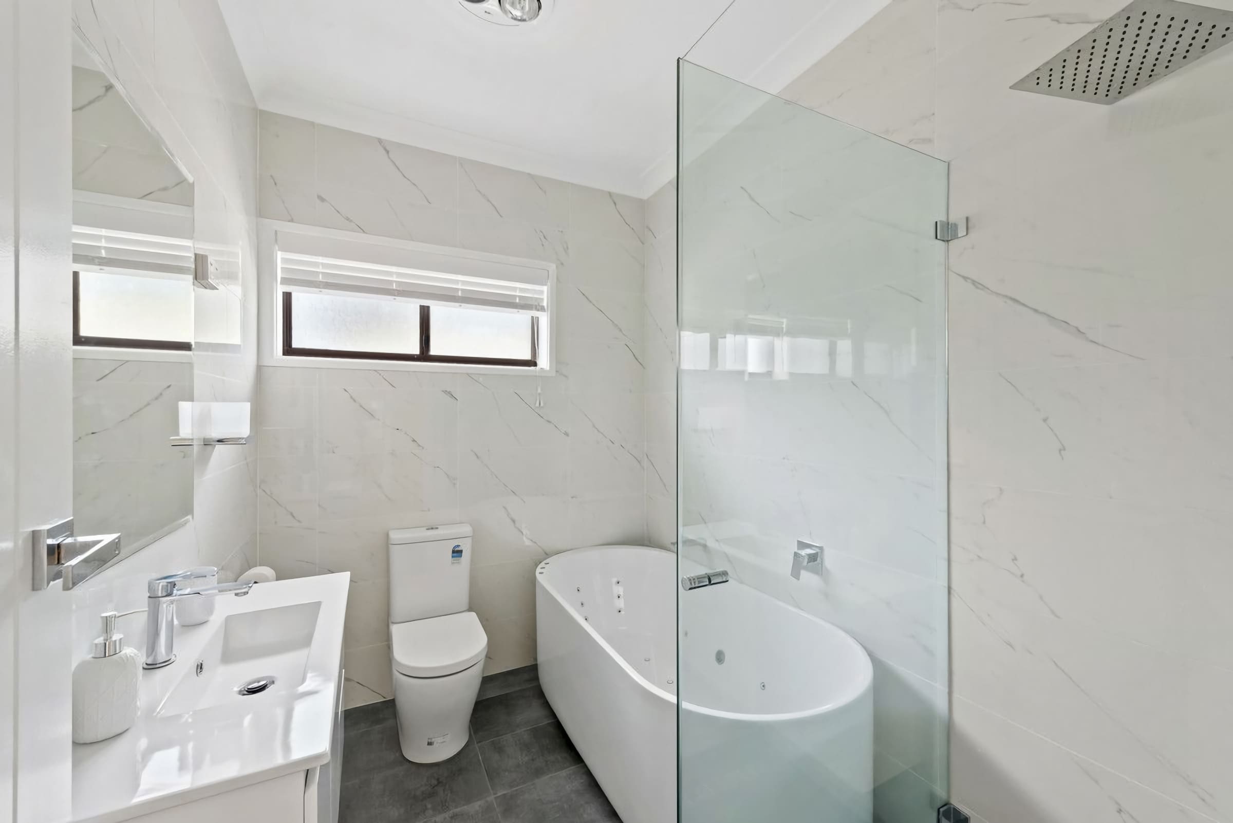 Bathroom 1: Spa bath, shower, vanity and toilet