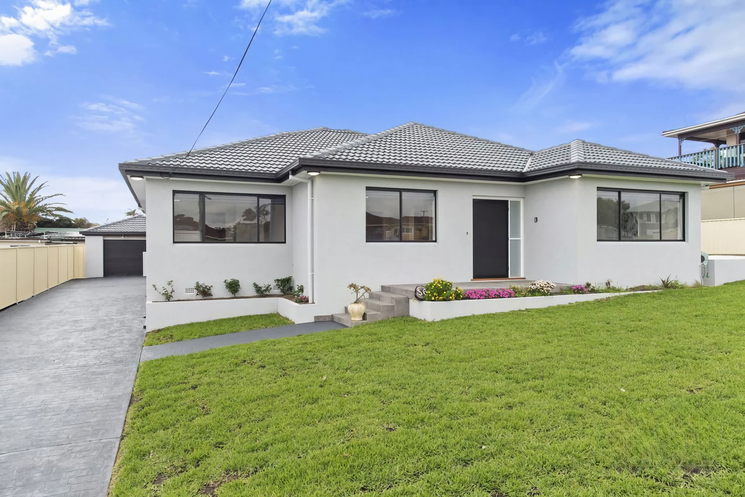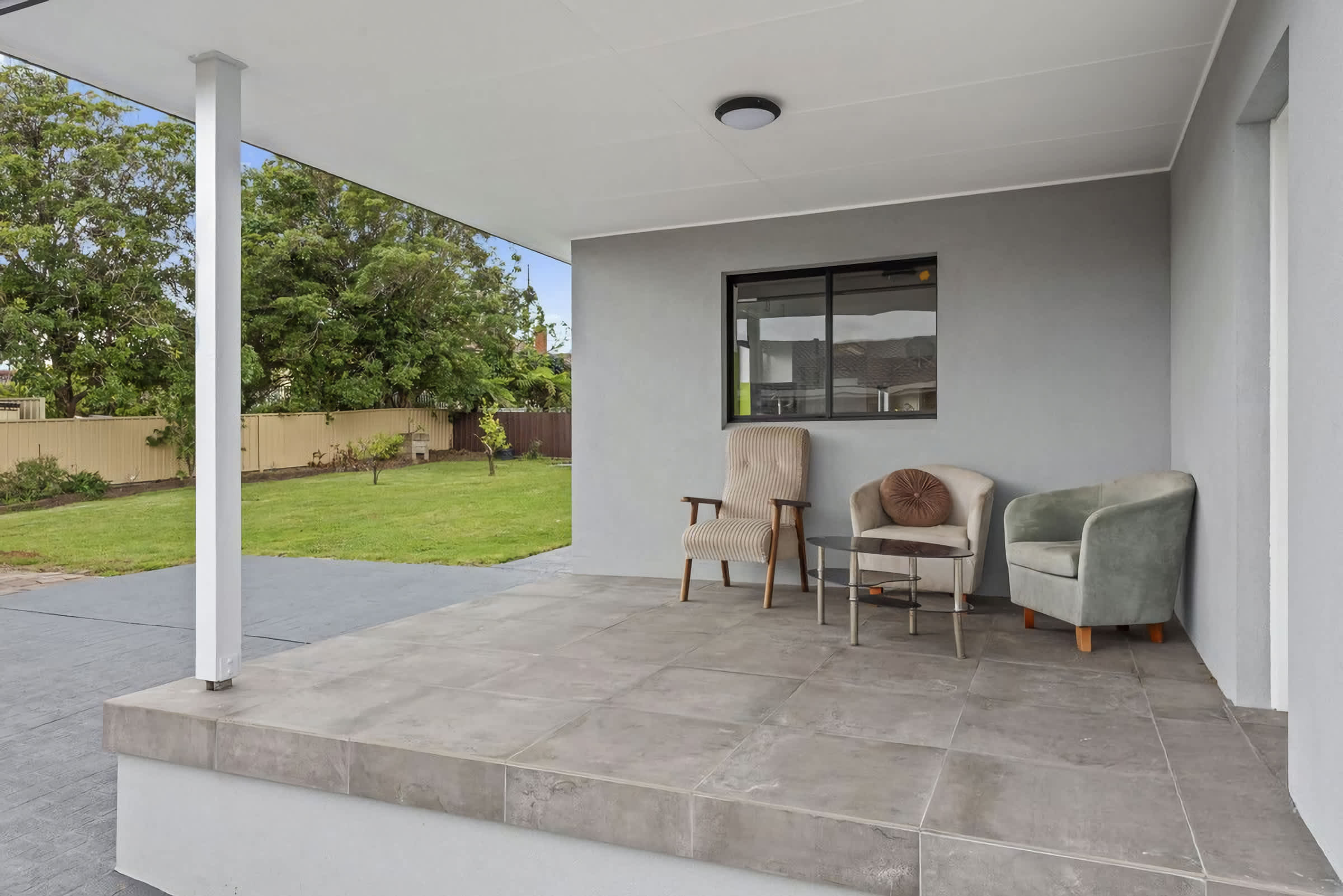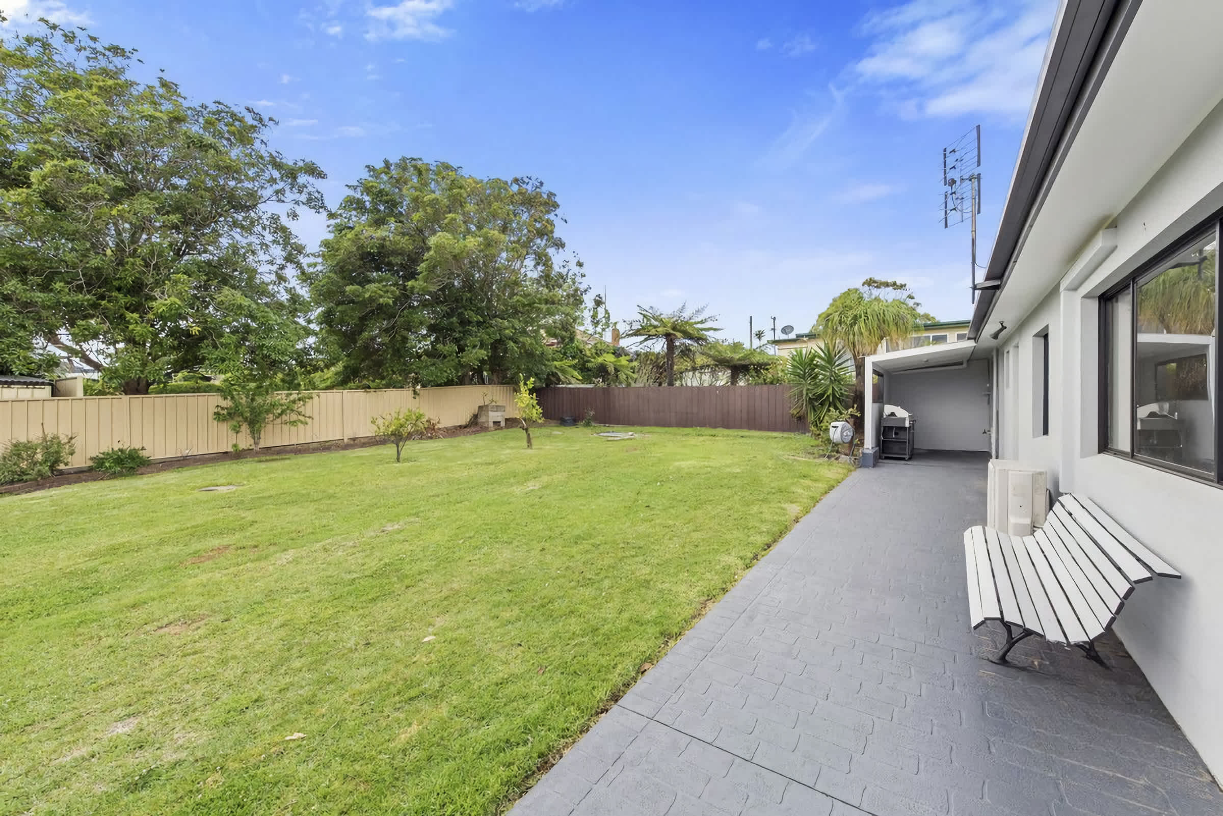 Fully fenced and level backyard including grassed area for the kids to play