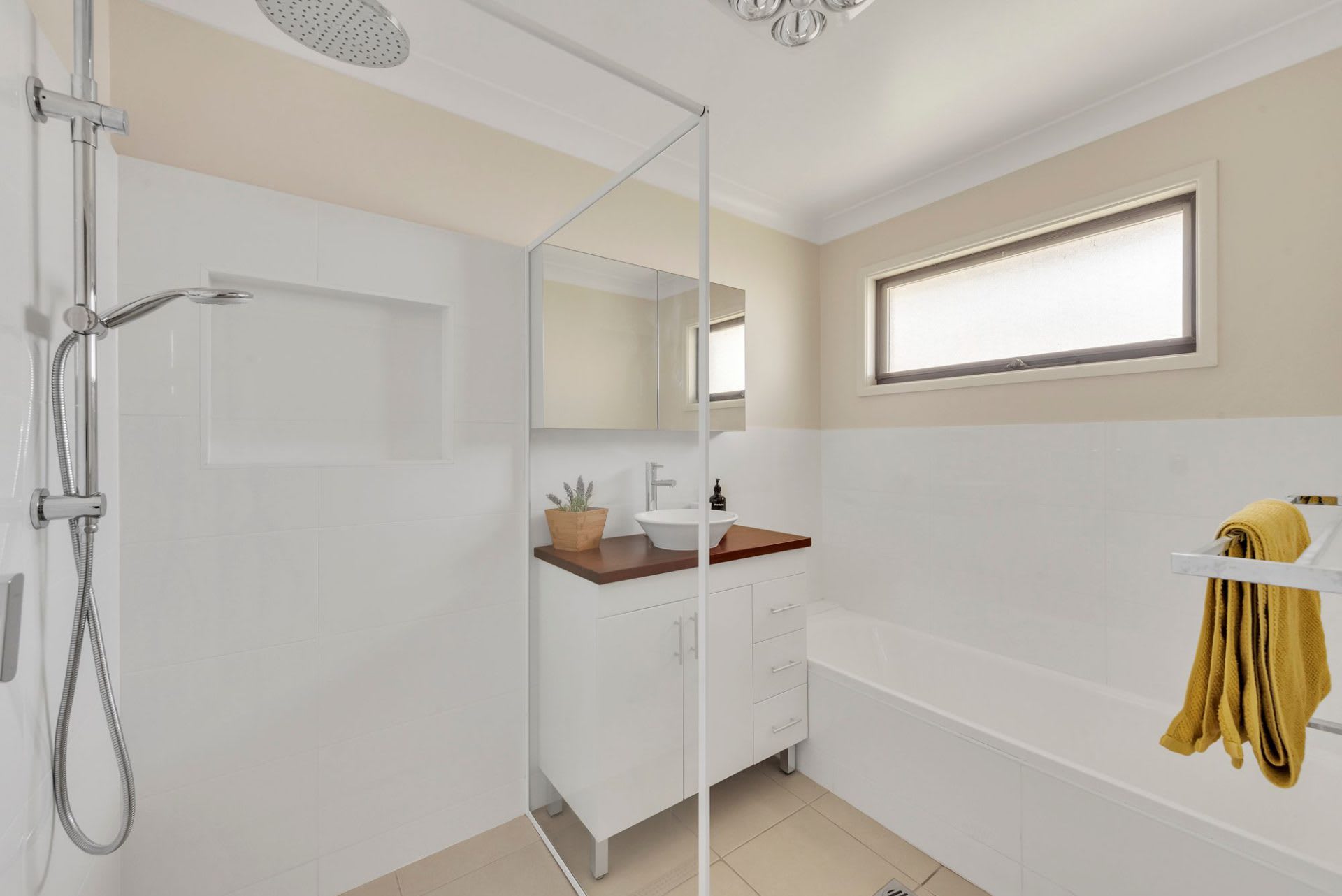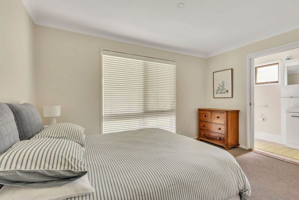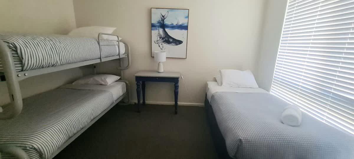 The home offers 3 bedrooms; one has a queen bed, TV and ensuite, another offers 2 single beds and the third bedroom has a bunk bed and single bed. The main bathroom has a bath, separate shower, and toilet, and the laundry has a washer and dryer. Off-street parking is available in the driveway.