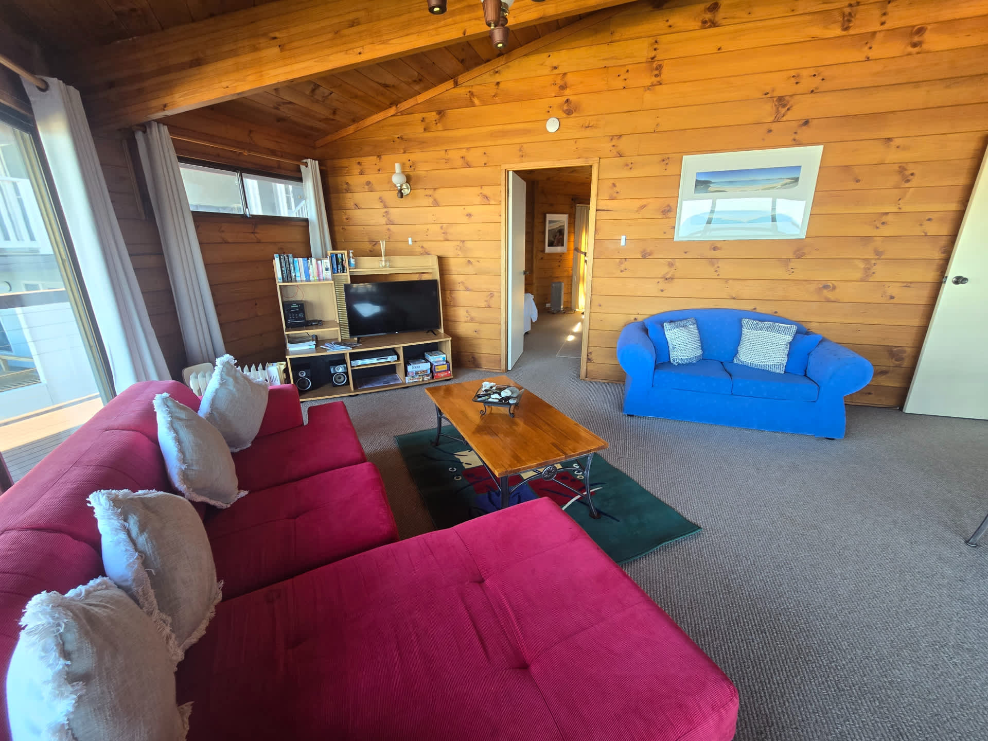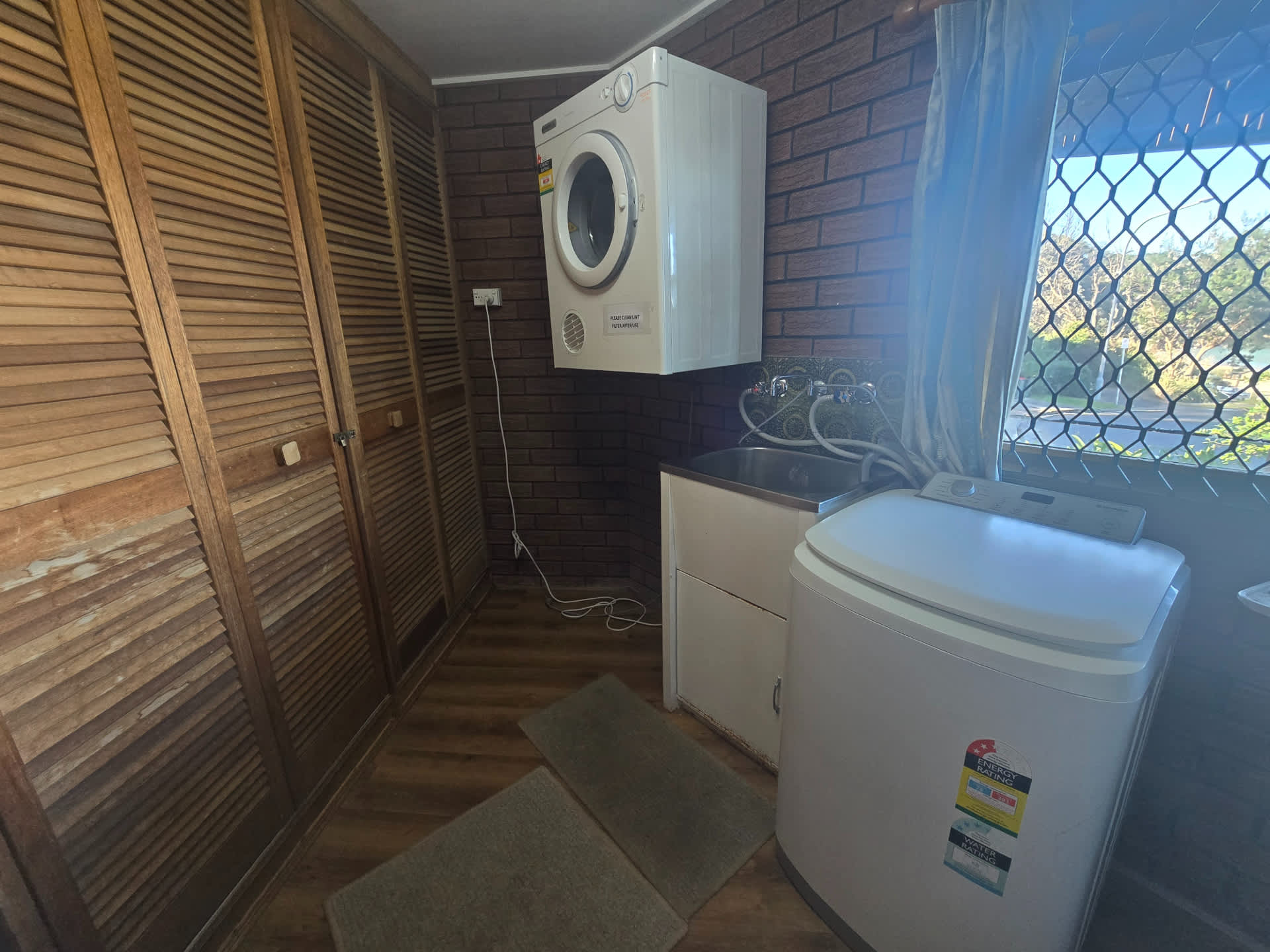 The house has a relaxed beach-house vibe and everything you need for an unforgettable beach holiday. Two storey, with all rooms including the kitchen and lounge are upstairs, the laundry is downstairs, as is the carport which can house 1 car only.