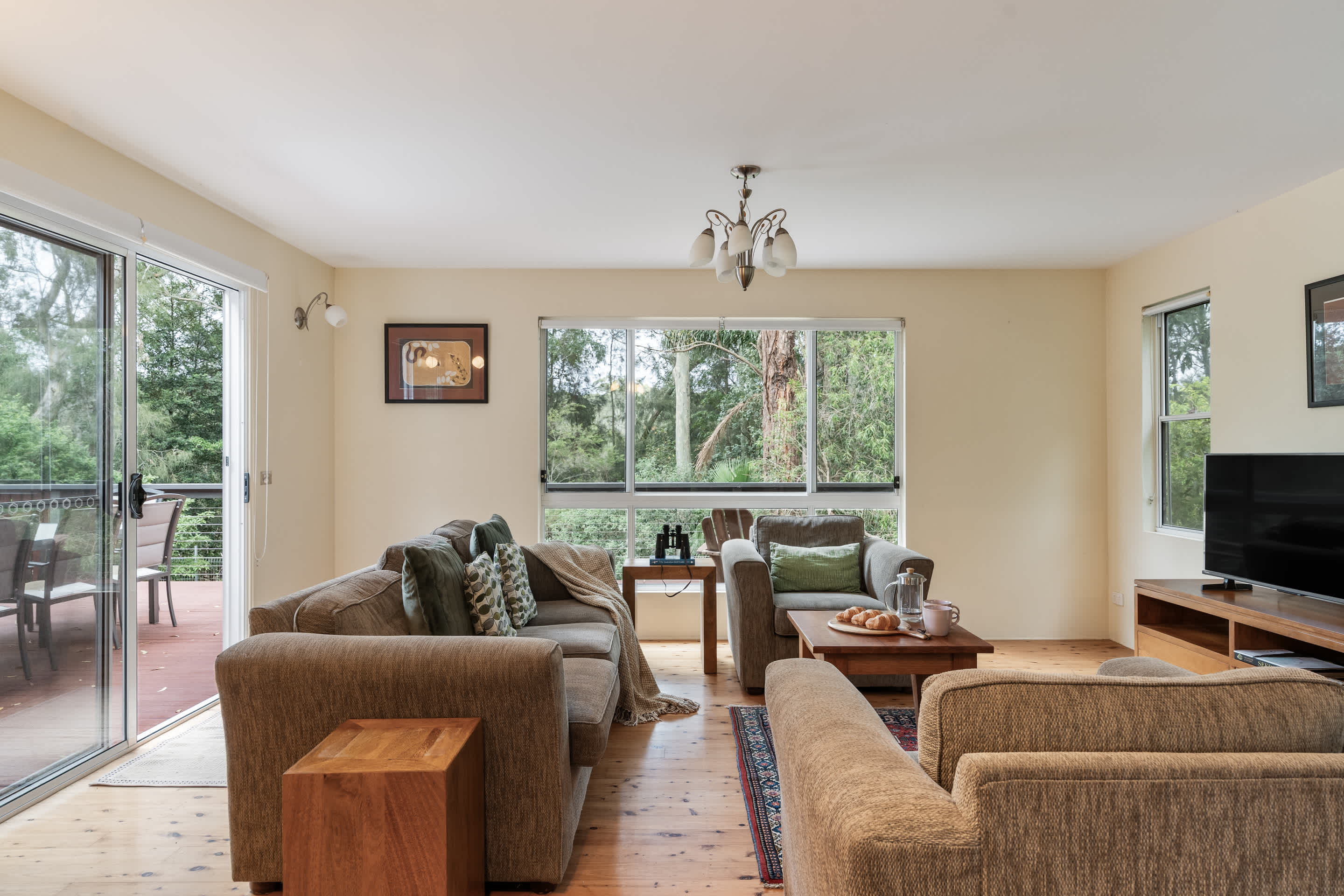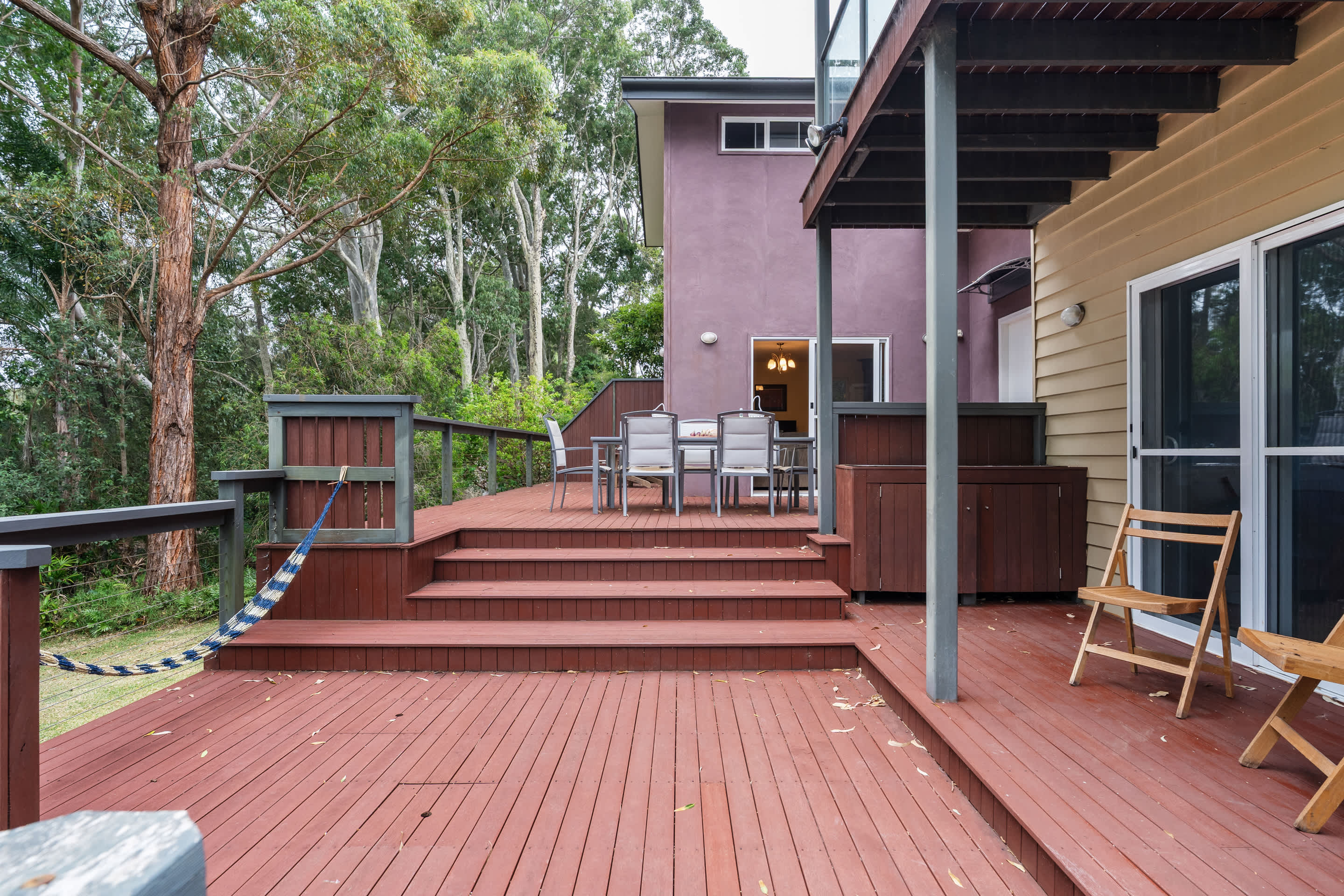 The open-plan living and dining area flows seamlessly onto the expansive outdoor entertaining deck, making indoor-outdoor living effortless. Whether you're sharing a family meal, enjoying a movie night, or simply relaxing after a beach day, there’s room for everyone to spread out and feel at home. The large covered deck overlooks peaceful bushland and offers ample seating for alfresco dining.