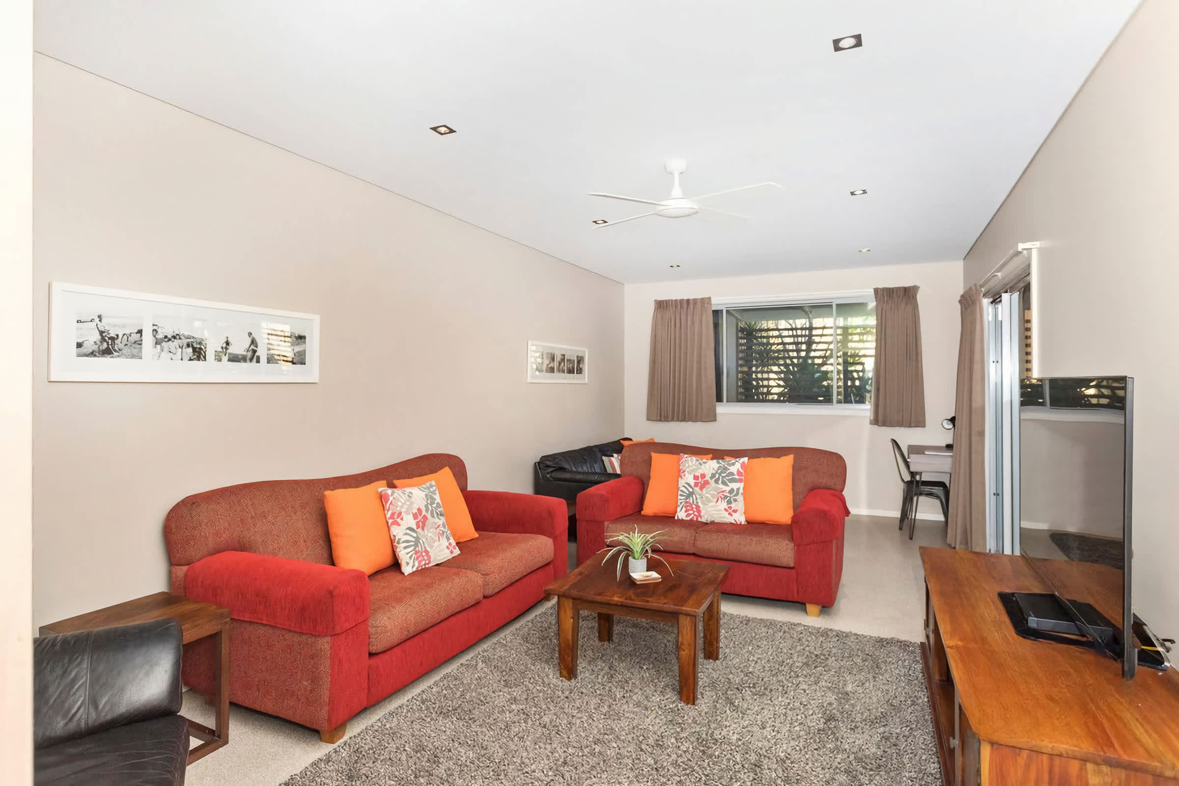 Lounge room has 4 and 2 seater lounges, TV, DVD and air conditioning