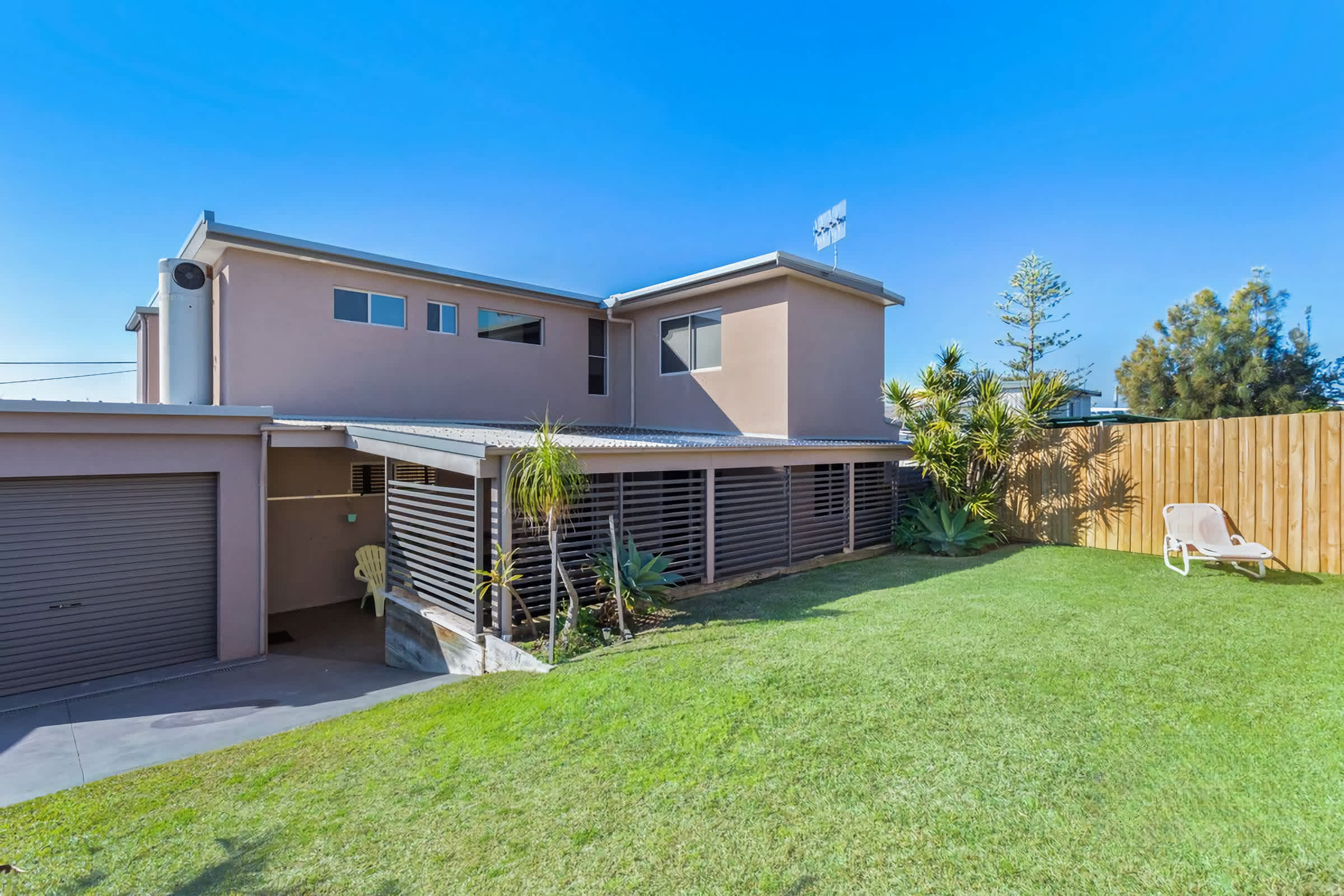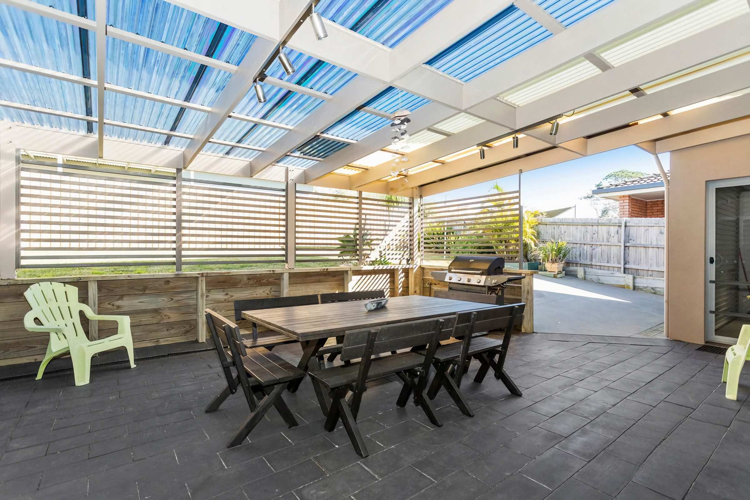 Back Deck has an outdoor setting for 10 guests and looks out to a grassed backyard.