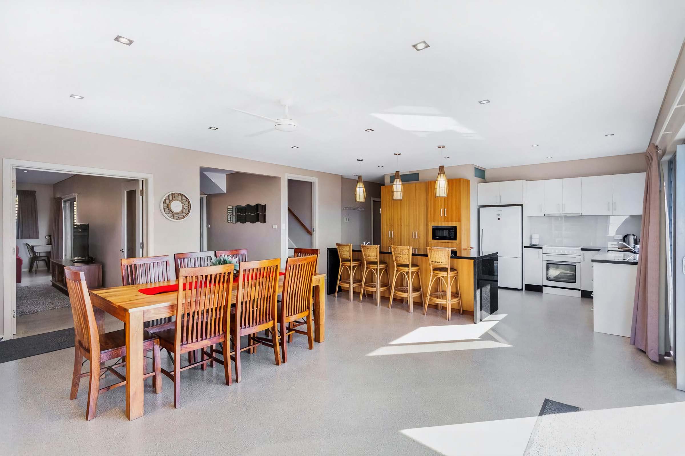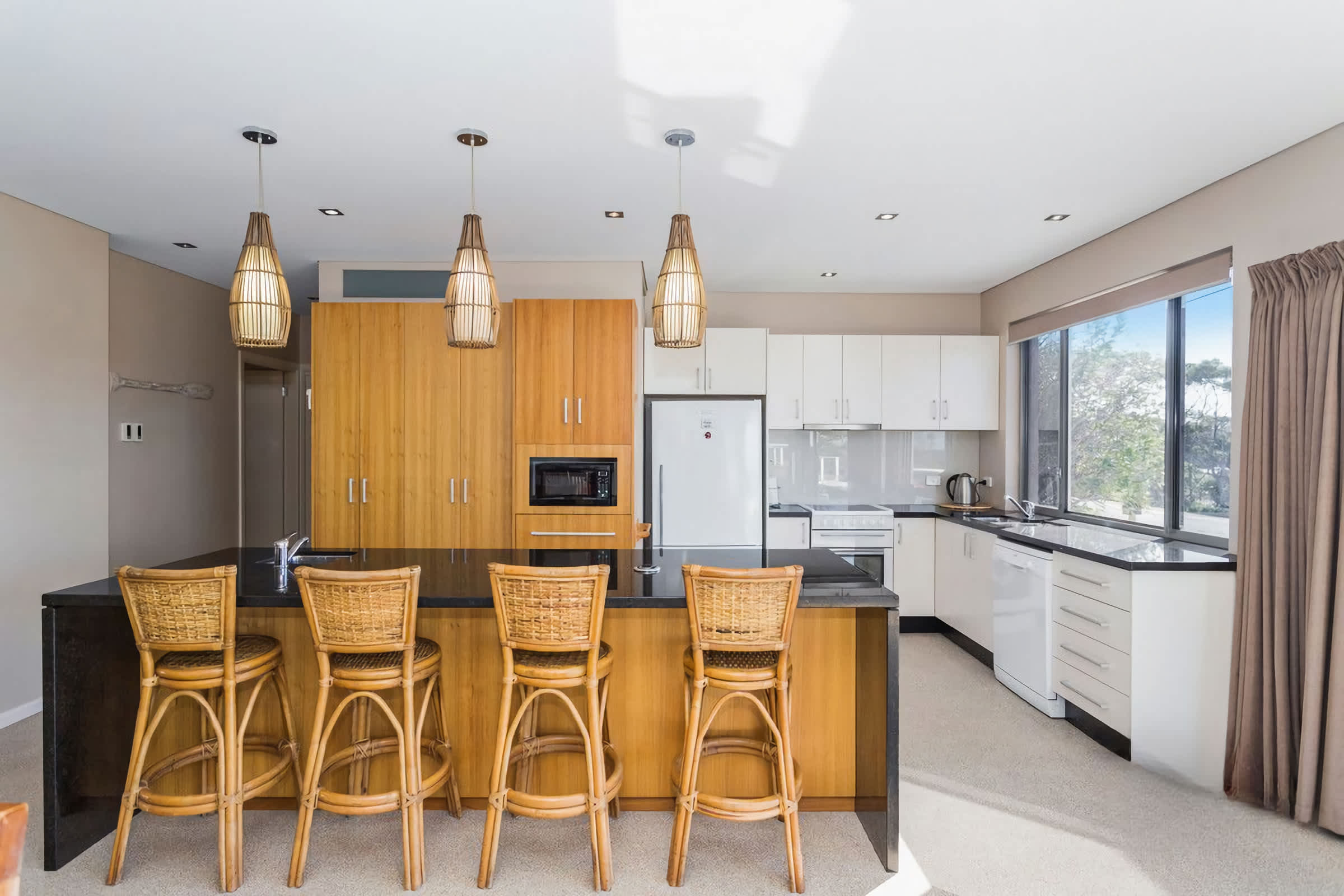 Fully equipped open plan kitchen with island bench/ breakfast bar with 4 seats and the room looks out toward the ocean. The kitchen has a microwave, electric oven and cooktop and cooking basics.