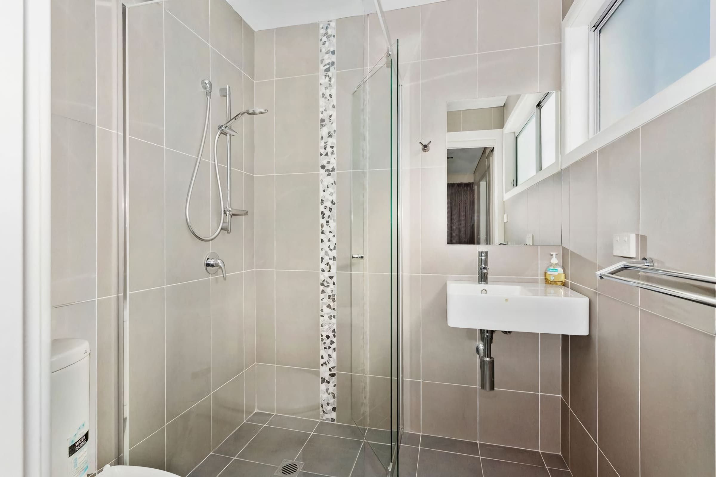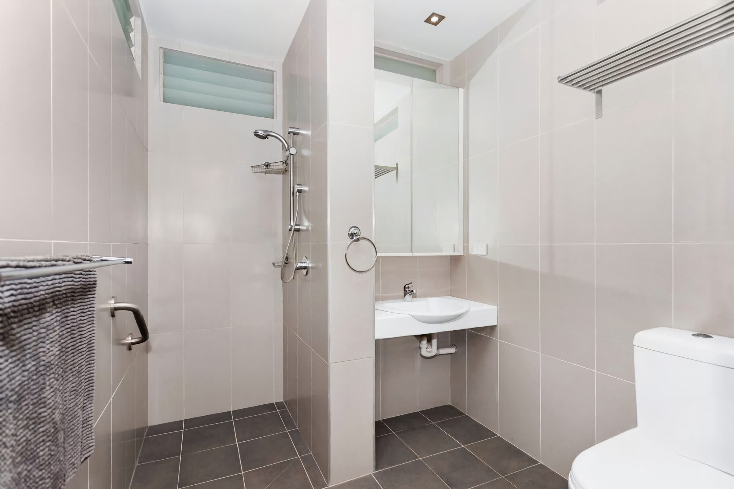 Bathroom (Downstairs) Shower with helping handle and toilet.