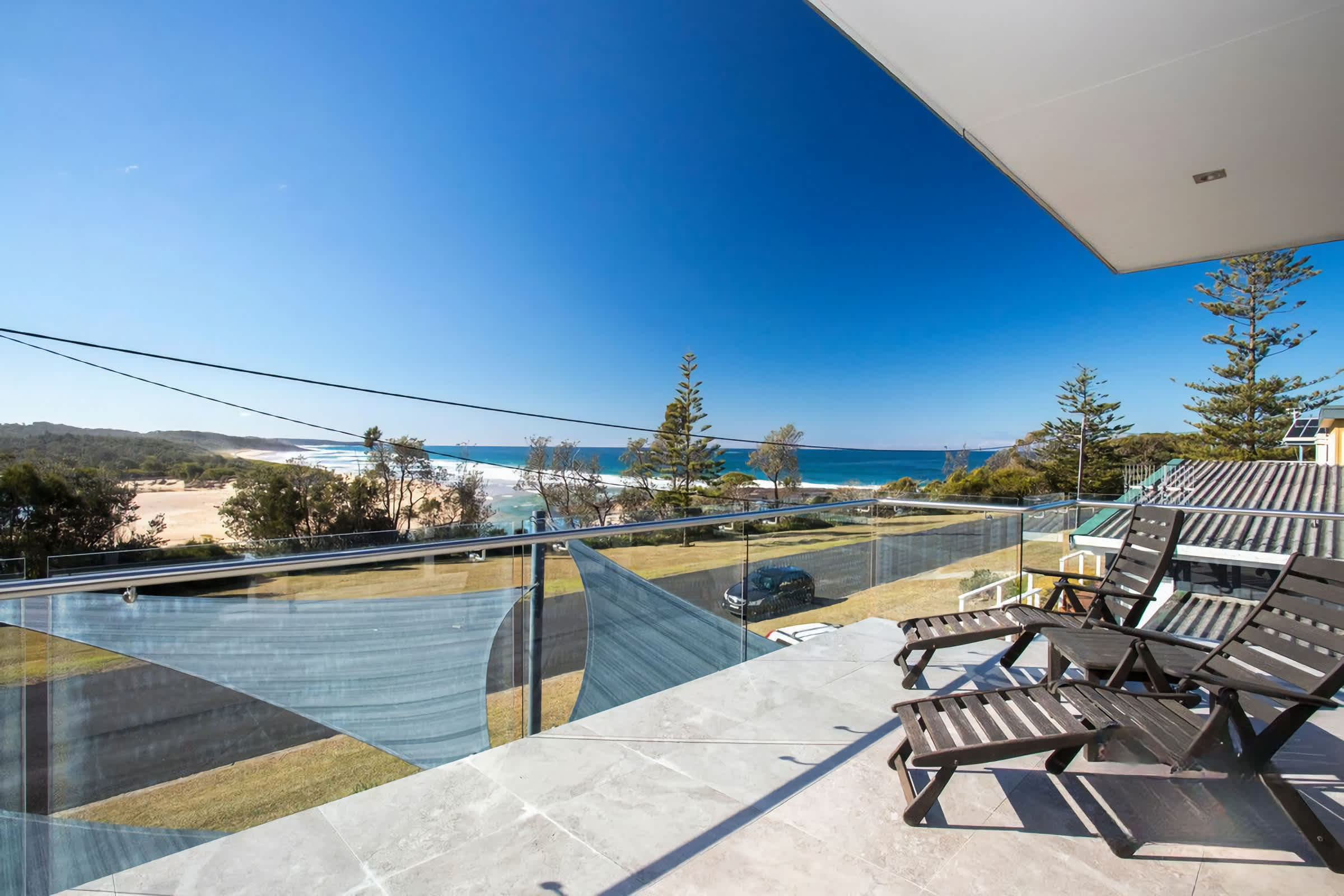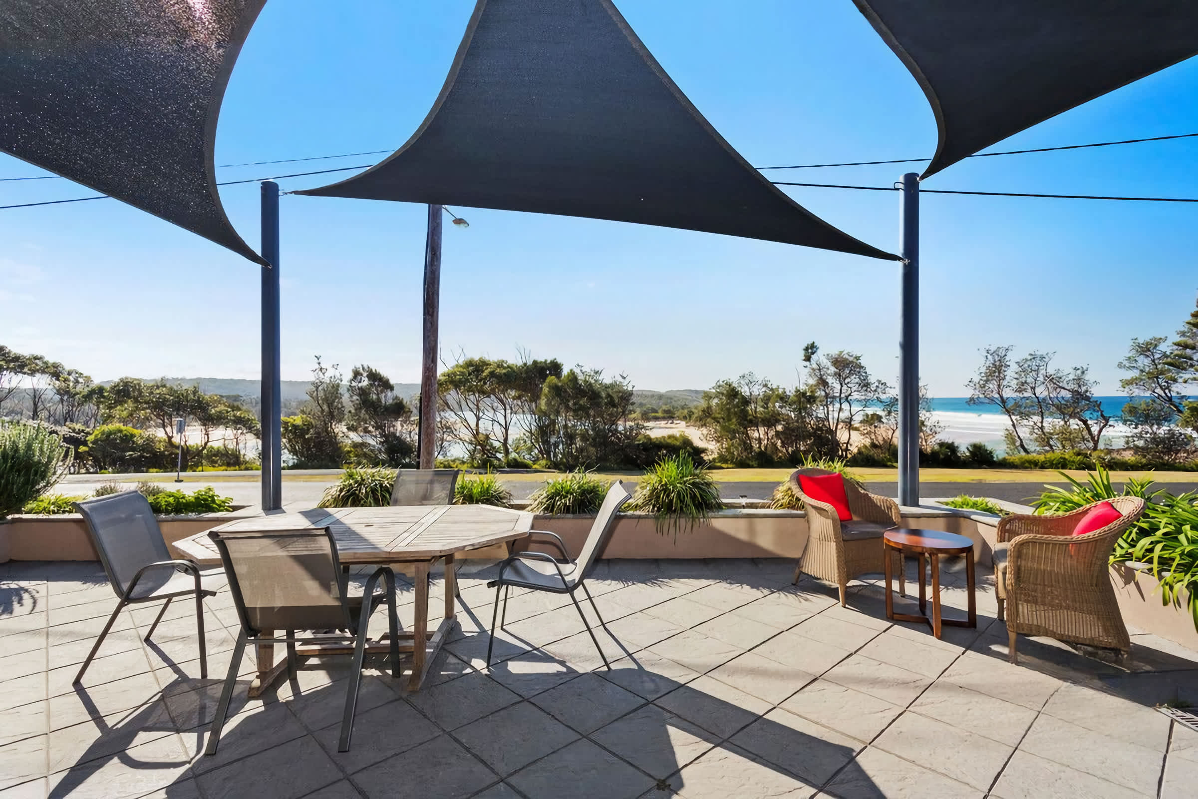 Front Deck has an outdoor setting for 6, shade sails and stunning ocean views