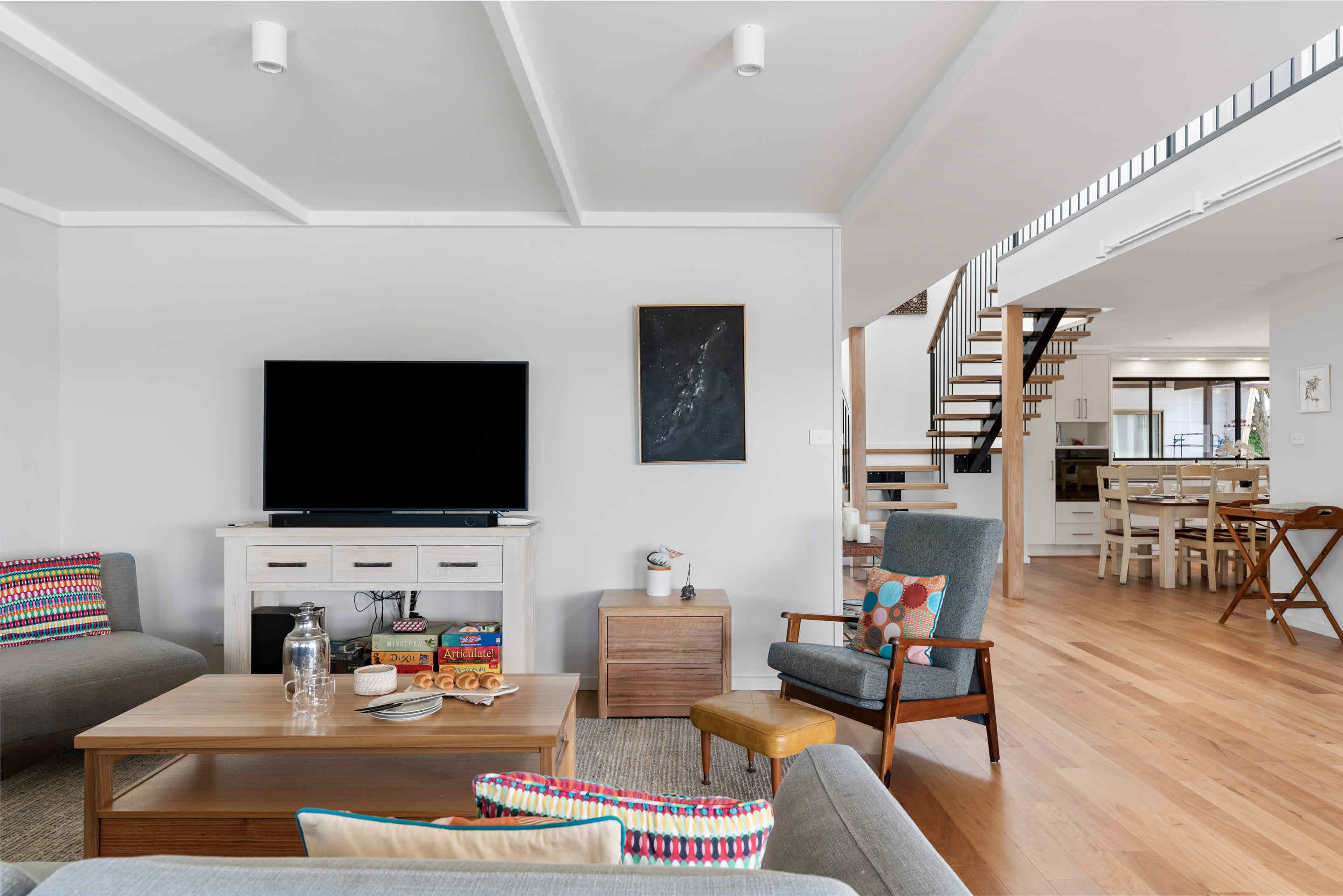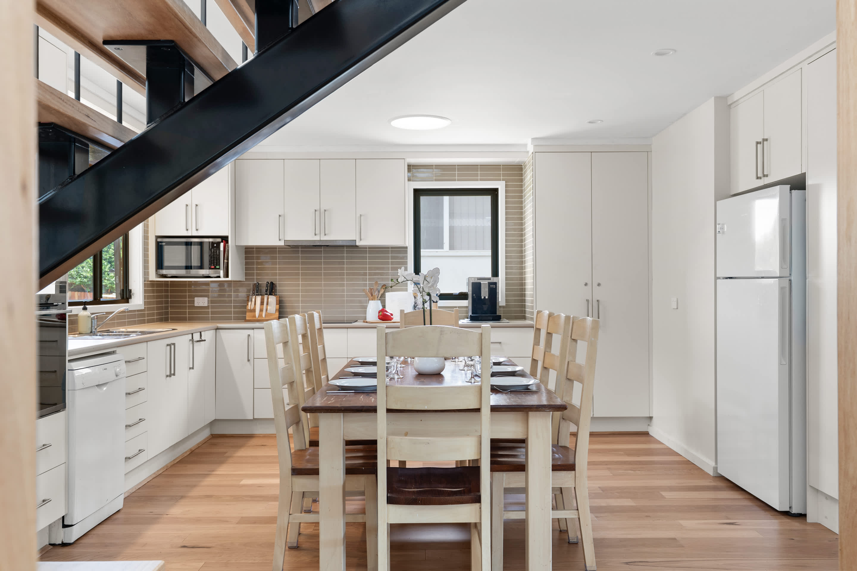 Inside, you’ll find a bright open plan living area featuring contemporary furnishings and generous space for families or groups to unwind. The fully equipped kitchen flows seamlessly into the lounge and dining zones, creating the perfect setting for shared meals and memorable moments throughout your stay.