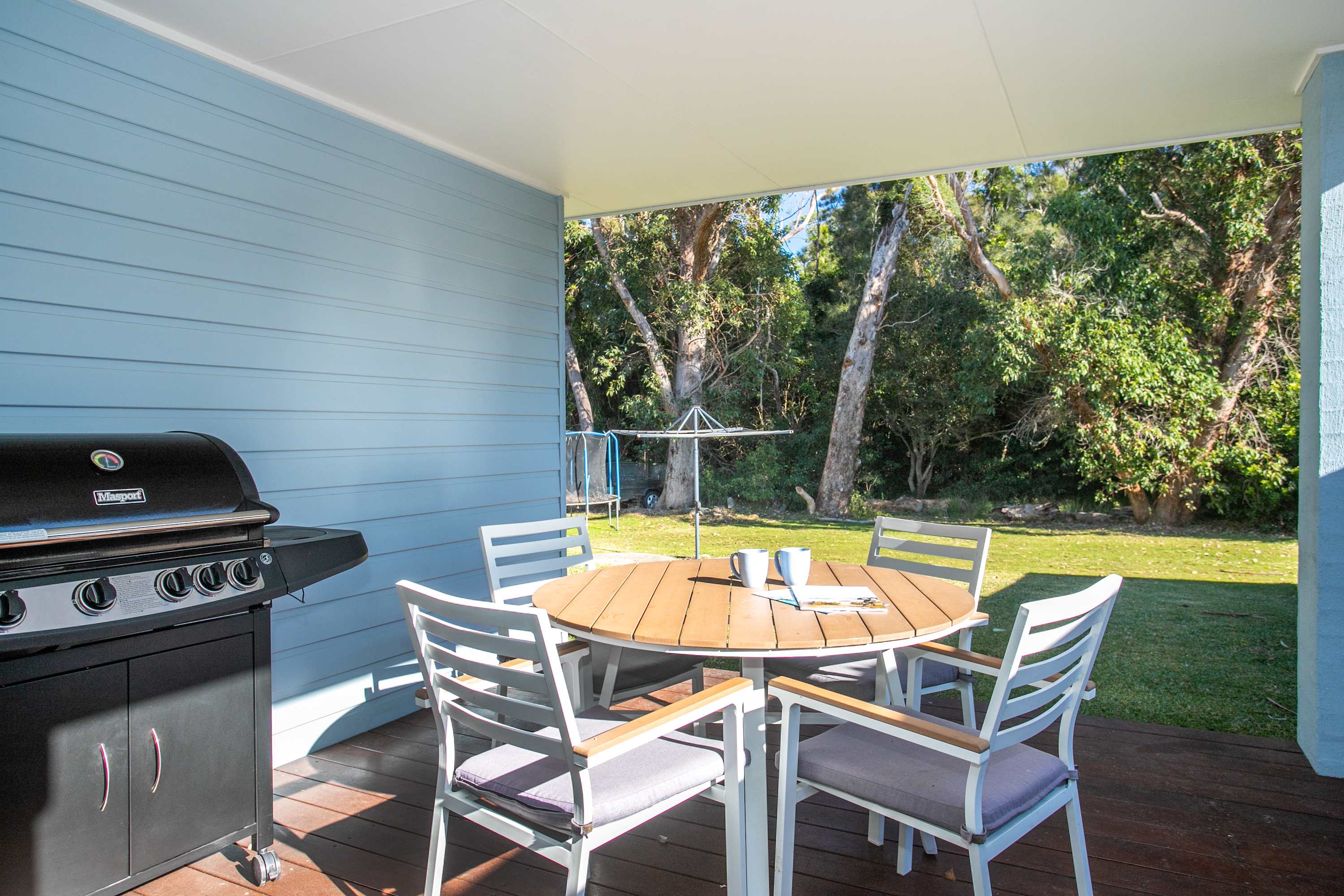 The kitchen is decked out with all the mod cons, Gas cooktop, Electric Oven, Breville Coffee Machine, Dishwasher and more. The main bathroom has a bathtub fit for a King, but only if he can get the Queen to give it up! The main bedroom has it’s own ensuite, located at the front of the house for parents own privacy. There are two lounge areas, one dedicated to the little ones with a DVD player and some DVD’s provided and let’s not forget the Trampoline out the backyard, ready for hours of jumping fun.