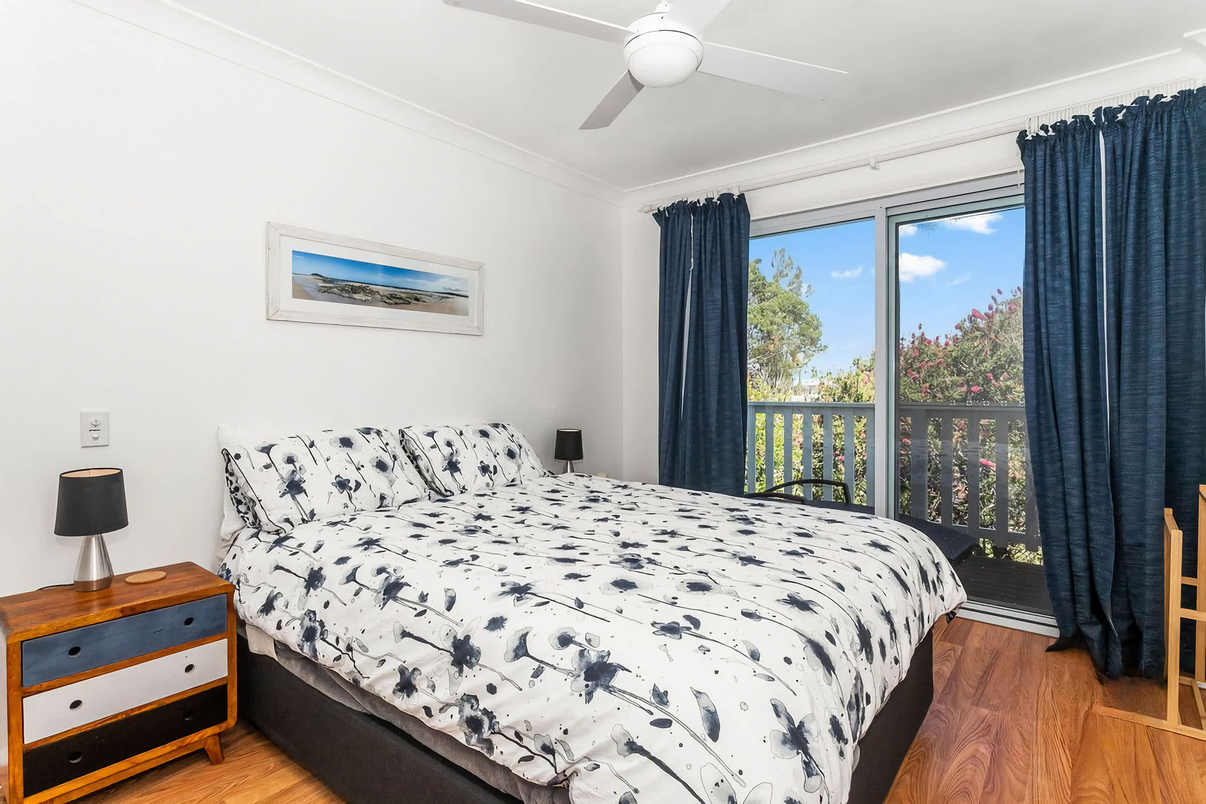 Bedroom 2 - Queen bed - Ceiling Fan - BIR - Oil Heater - Access to a private balcony with garden views