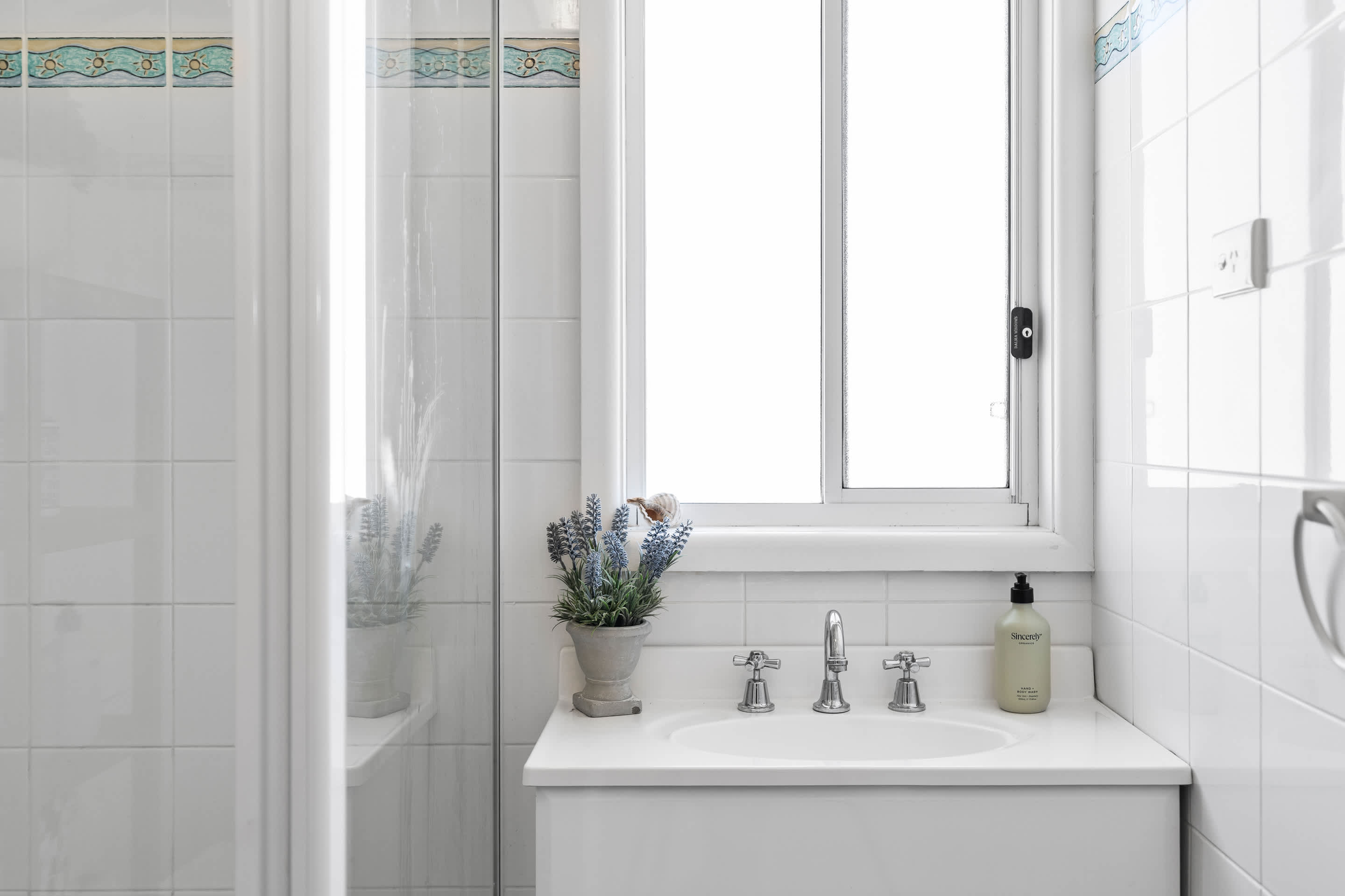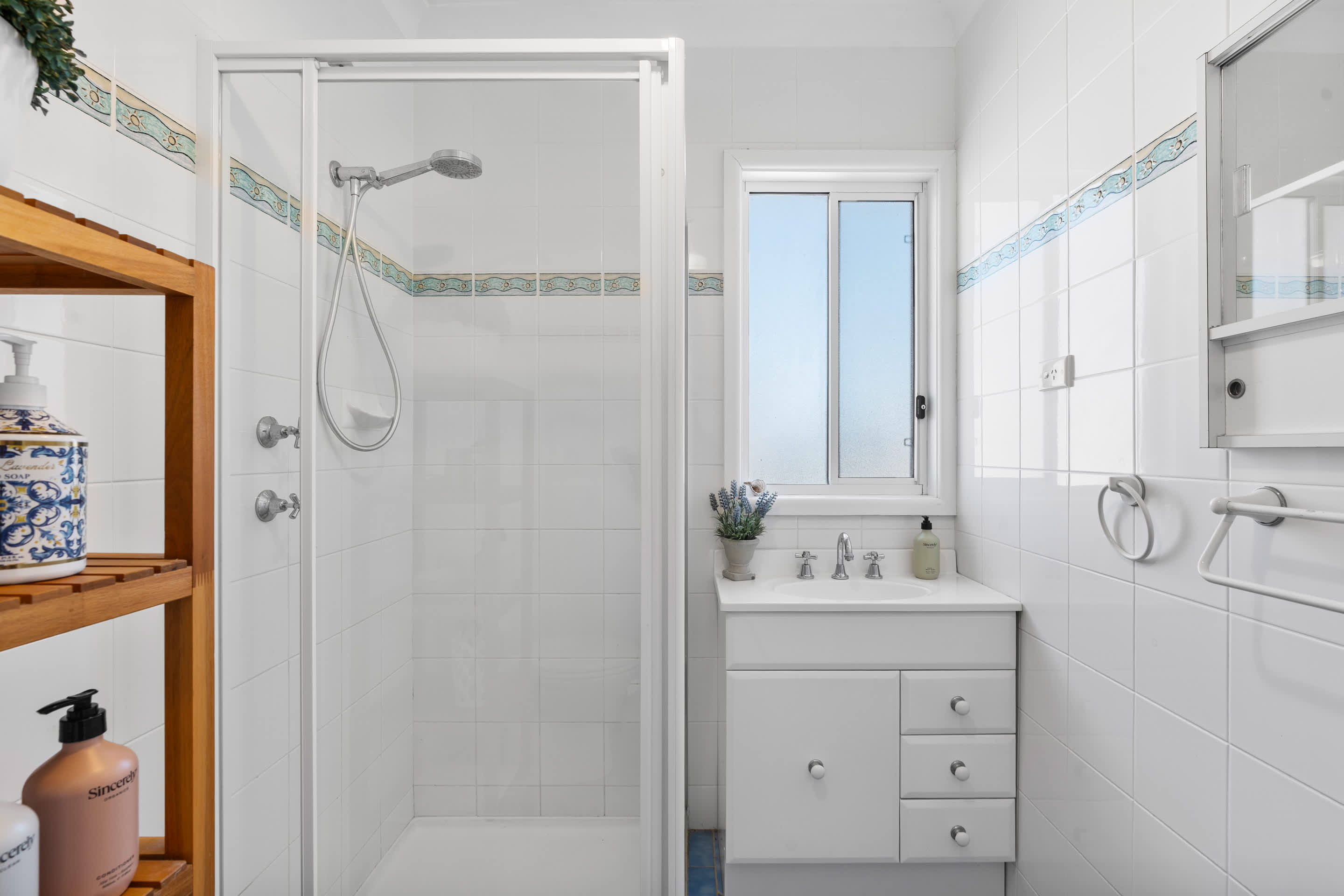 Bathroom 2 (Upstairs): Shower, toilet, vanity