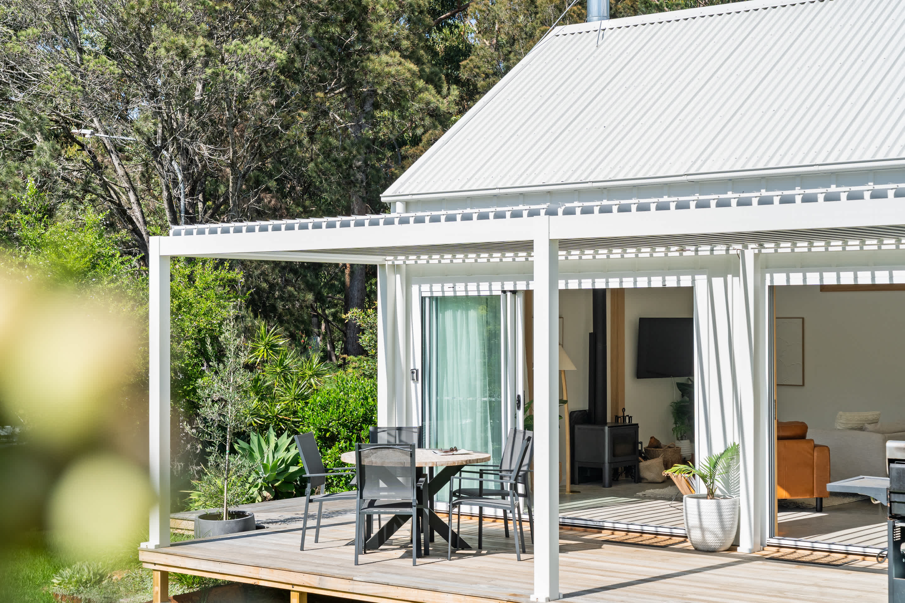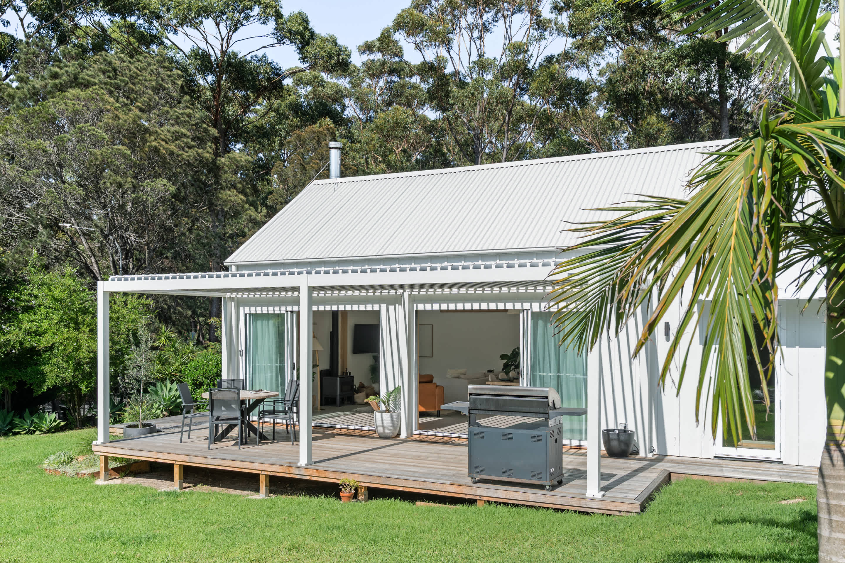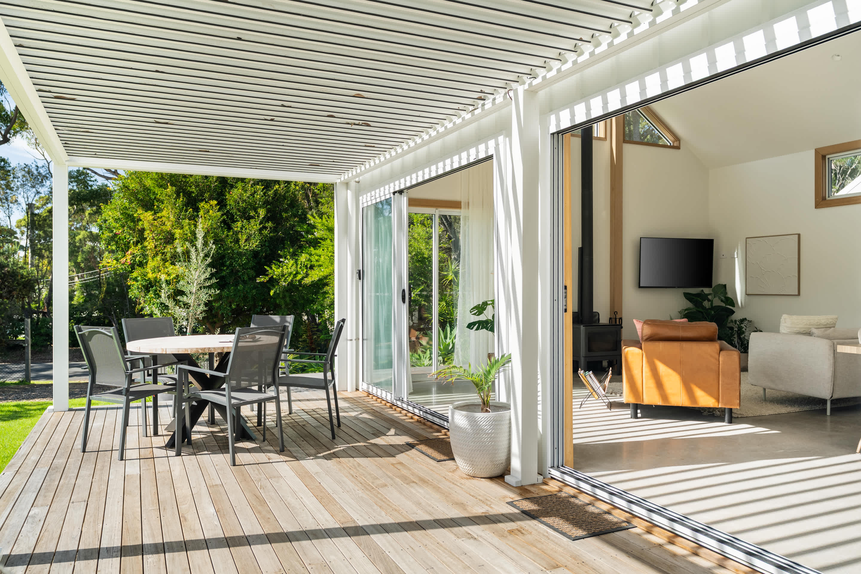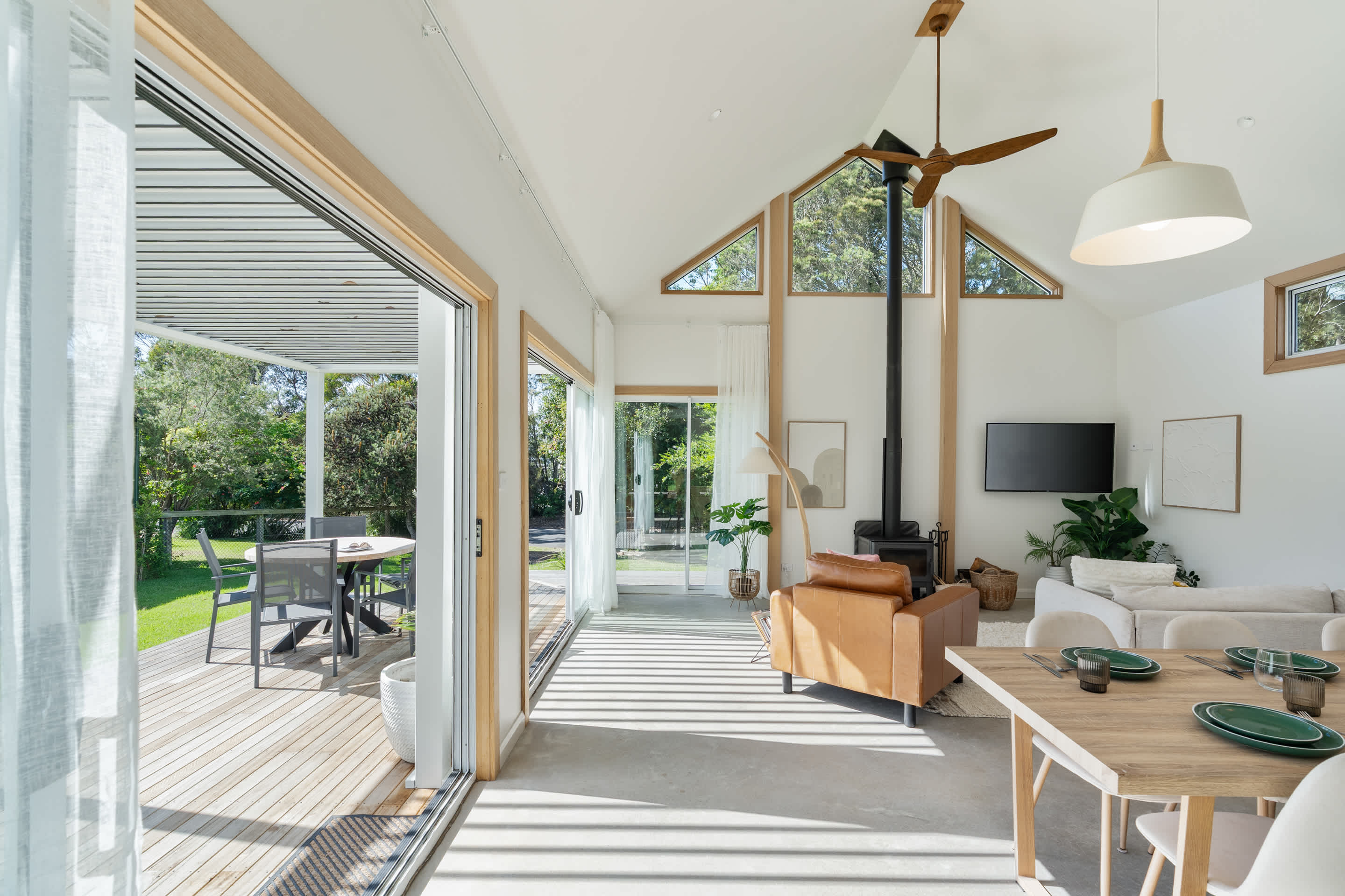 The open-plan kitchen, living, and dining area flows effortlessly onto a sun-drenched deck, with an electric louvered pergola where you’ll find a six-burner gas BBQ and a fully fenced yard—perfect for kids and pets to play safely. As the sun sets, gather around the fire pit under a canopy of stars for unforgettable evenings.
