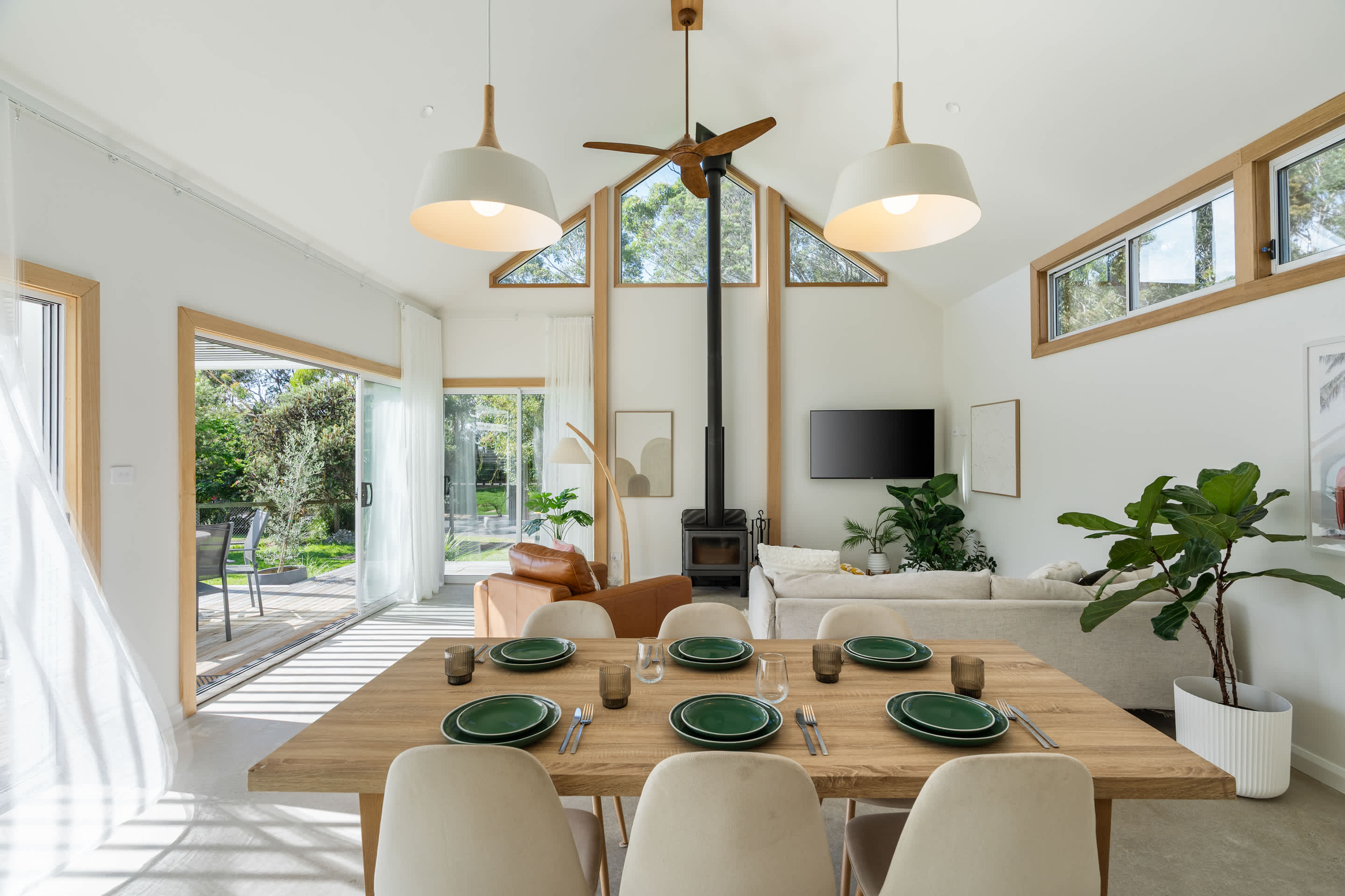 Inside, enjoy a well-equipped kitchen with everything you need, including a dishwasher and pod coffee machine. In winter, curl up by the beautiful combustion wood fireplace, and in summer, stay cool with ceiling fans in every room.