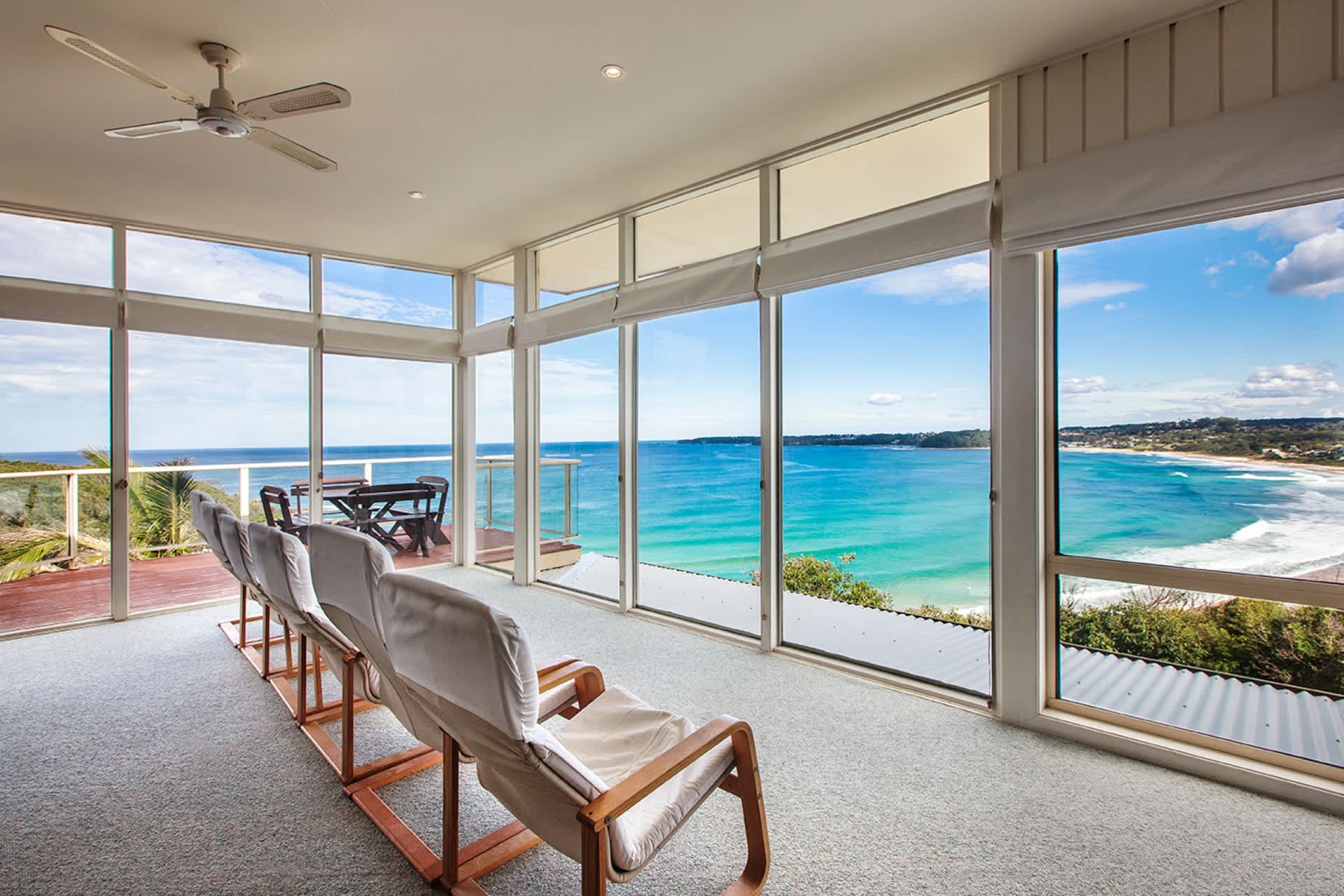 Upon arrival you will be astonished by the breathtaking panoramic beach and ocean views. Quietly hidden yet only a short walk to Mollymook beach, this home really is in an amazing location. The large timber deck is perfect for relaxing and watching the sunrise. Light filled rooms and an abundance of glass invites the outdoors into the open plan living area.